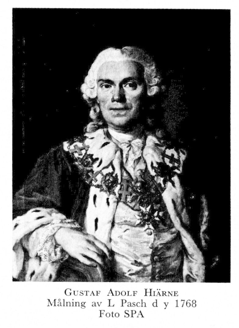 2 Hiärne, Gustaf Adolf, son till H 1 i hans tredje g, dp 5 nov 1715 i Sthlm, Hovf, d 19 april 1805 på Ekensberg, Överenhörna, Söd. Eo tjänsteman i krigskoll april 30, volontär vid artilleriet i Sthlm aug 31, konstapel vid överstelöjtn Carl Siöblads kompani maj 32, underlöjtn där 5 maj 33, löjtn vid artilleriet i Stralsund 21 okt 38, regementskvartermäst där 11 febr 43, kapten vid artilleriet på Gotland 1 juni 43, major vid artilleriet i Finland 8 dec 47, överstelöjtn vid Björneborgs infanterireg 16 mars 48, överste i armén 19 juni 58, överste för Nylands infanterireg 10 juli 58, tf landsh i Nylands o Tavastehus län 22 april 60, riksråd 7 okt 61, frih 6 aug 62, led av dir för Trollhätte kanals byggande o föredragande för K M:t i dess ärenden 31 okt 66, kansler för LU 30 maj 68, greve 15 maj 70, beviljad begärt avsked från riksrådsämbetet 27 mars 72, återinsatt i rådet 22 aug 72, entledigad från riksrådsämbetet 12 maj 89. — RoKKMO 63.