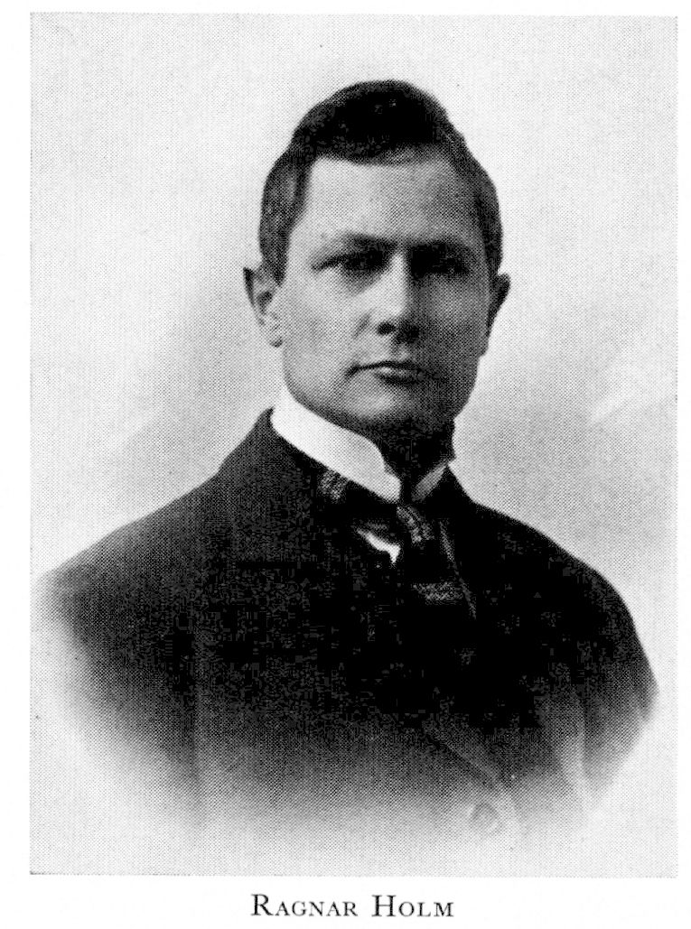 Holm, Ragnar, f 6 maj 1879 i Skara, d 28 febr 1970 i S:t Marys, Penn, USA. Föräldrar: läroverksadj Gerhard Ulrik H o Augusta Charlotta Mathilda Bergqvist. Mogenhetsex vid h a l i Skara 26 maj 98, inskr vid UU ht 99, FK där 29 maj 01, assistent vid La station franco-scandinave de sondages aériens i Hald 02—03, FL vid UU 14 sept 05, assistent hos prof K Ångström, Uppsala 05—06, disp pro gradu 17 maj 08, FD 30 maj 08, lär vid Sthlms samgymn 08 —09, fysiker vid Siemenskoncernen i Berlin 09—19, fysiker vid Telegrafverkets undervisn: anstalt 19—21, lär där o vid Farmaceutiska inst vt 21, lektor i matematik o fysik vid Tekn gymn i Örebro aug 21—30, fysiker vid Siemens forskn:lab:er i Berlin 30—45, chef för lab:et hos Stackpole Carbon Co i S:t Marys från 47.