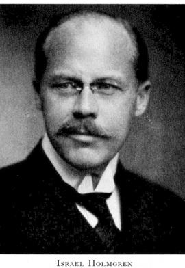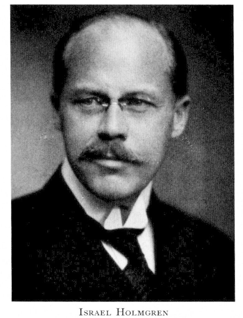 7 Holmgren, Israel Frithiofsson, son till H 4 o H 5, f 12 juni 1871 i Uppsala, d 20 sept 1961 i Ekerö, Sth. Mogenhetsex vid h a lärov i Uppsala 89, inskr vid UU ht 89, med fil ex 29 maj 90, amanuens vid kem institutionen i Uppsala 92—93, vid fysiol institutionen 93—95, MK vid UU 29 nov 95, Regnells amanuens vid Serafimerlasarettets med klinik 98—99, v ordf i Med fören 98—00, ordf där 00—01, underläk vid Sthlms sjukhem 1 juli 00—31 mars 02, ML vid Karol inst 15 jan 02, amanuens vid Sabbatsbergs med avd o läk vid Sabbatsbergs sjukhus 1 maj 02—31 aug 04, amanuens vid med kliniken där 04—05, vid med polikliniken där 05—06, tf överläk vid med avd vid Falu lasarett 1 okt 06, överläk där 1 febr 07, disp pro gradu vid Karol inst 6 nov 09, tf överläk o dir vid tuberkulosavd vid S:t Görans sjukhus 15 nov 09, doc i med vid Karol inst 17 dec 09, läk o dir vid S:t Görans sjukhus 1 juli 10, MD vid Karol inst 13 dec 10, prof i med där 25 april 13, andre överläk vid Serafimerlasarettet 13, överläk o förestånd för med kliniken där 14—36, led av lasarettets direktion 14—36, dir 16—36, led av medicinalstyns vetenskapl råd 15—17, vetenskapl rådgivare hos arméförvaltn:s sjukvårdsstyr 18—20, principal vid Sthlms sjukhem 22, ordf i Sv läkaresällsk 24—25, i Sv fören för invärtes medicin 24— 25, led av FK 26—33. — LVS 38.