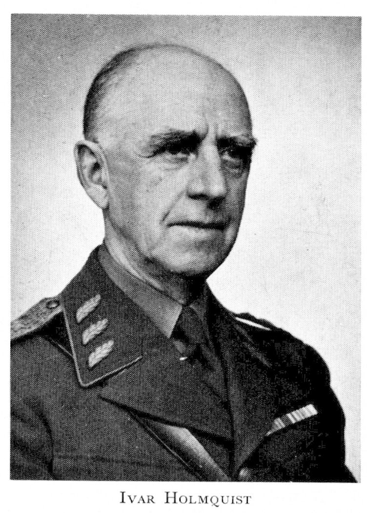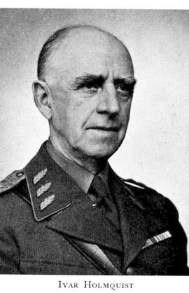 2 Holmquist, Carl Axel Fredrik Ivar, son till H 1, f 22 febr 1879 i Helsingborg, d 24 sept 1954 i Djursholm. Mogenhetsex vid Nya elementarskolan i Sthlm 15 maj 97, volontär vid Livreg till fot 22 maj 97, vid Göta livg 12 aug 99, officersex vid Karlberg 25 nov 99, underlöjtn vid Göta livg 8 dec 99, elev vid Krigshögsk 2 okt 02—27 juni 04, löjtn av 2 kl vid Göta livg 26 juni 03, aspirant vid Generalstaben maj 05—maj 07, löjtn av 1 kl vid Göta livg 1 febr 07, stabsadj o löjtn vid Generalstaben 6 nov 08, lär i militärgeografi vid Krigshögsk 1 okt 11—17, stabsadj o kapten i Generalstaben 25 juni 12, sekr i Sveriges militära idrottsförb 12— 17, stabsadj o kapten av 1 kl vid Generalstaben 18 juli 13, kapten i Göta livg 24 jan 14, kapten av 2 kl 5 sept 16, av 1 kl 1 jan 17, stabschef vid Ålandsdetachementet 18, sekr vid förhandhar om demolering av befästningarna på Åland 18, sv regeringens ombud där 19, genomgick krigshögsk i Paris 19—20, åter stabsadj o kapten vid Generalstaben 12 sept 19, överadj o major där 31 dec 19, sakk i ålandsfrågan inför Nationernas förbunds råd 20 o 21, stabschef vid Infanteriinspektionen 22 aug 21, ordf i Fören för skidlöpningens och friluftslivets främjande i Sverige 23—49, v ordf i Sv skidförb 23—46, president i Internationella skidförb 24—34, major vid Göta livg 28 mars 24, överstelöjtn i reg 17 april 25, led av fälttjänstreglementskomm 26—28, överstelöjtn vid reg 1 nov 26, överste o chef för Norrbottens reg 20 maj 27, sakk ang omorg av krigsdomstolarna 32, överste o brigadchef vid N arméfördeln 16 mars 34, generalmajor i armén 13 dec 35, chef för Andra arméfördeln 30 april 37, generallöjtn o chef för armén 1 okt 40—31 mars 44, ordf i försvarets upplysn:utredn 17 mars 44—1 maj 45. — LKrVA 32.