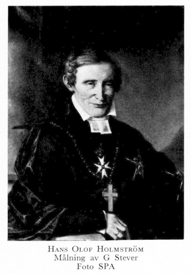 Holmström, Hans Olof, f 15 okt 1784 i Ösmo, Sth, d 27 aug 1855 i Uppsala. Föräldrar: komminister Stefan H o Engela Risberg. Elev vid Strängnäs gymn, inskr vid UU 10 febr 03, FK 4 dec 05, mag 14 juni 06, TK 8 febr 09, disp för docentur 12 dec 10, doc i latin febr 11, allt vid UU, prästv 7 sept 15, eo adj vid UU:s fil fak mars 16, gymnasieadj i Strängnäs 7 jan 18, konsistorienotarie där 24 april 18 (tilltr 1 maj 19), lektors n h o v 29 sept 20, fil lektor i Strängnäs 29 aug 21, deltog i riksdagarna 28—54 (v talman i prästeståndet 50—51, talman 54), kh i Dunker o Lilla Malma, Söd, 17 mars 28, prost 17 maj 28, domprost i Strängnäs 7 nov 28 (tilltr 1 maj 29), TD 10 nov 30, prom vid UU 14 juni 31, biskop i Strängnäs stift 14 febr 39, ärkebiskop o UU:s prokansler 17. jan 52. — LVA 53, HedLVHAA 53, LoKKMO 54.