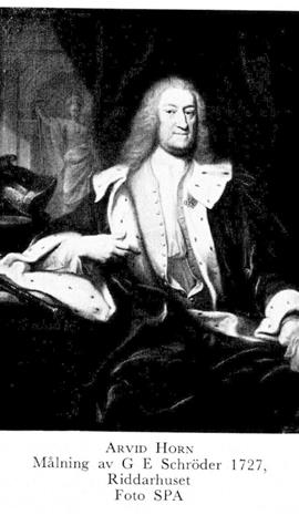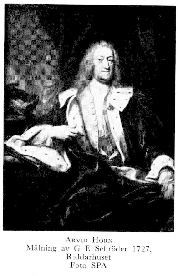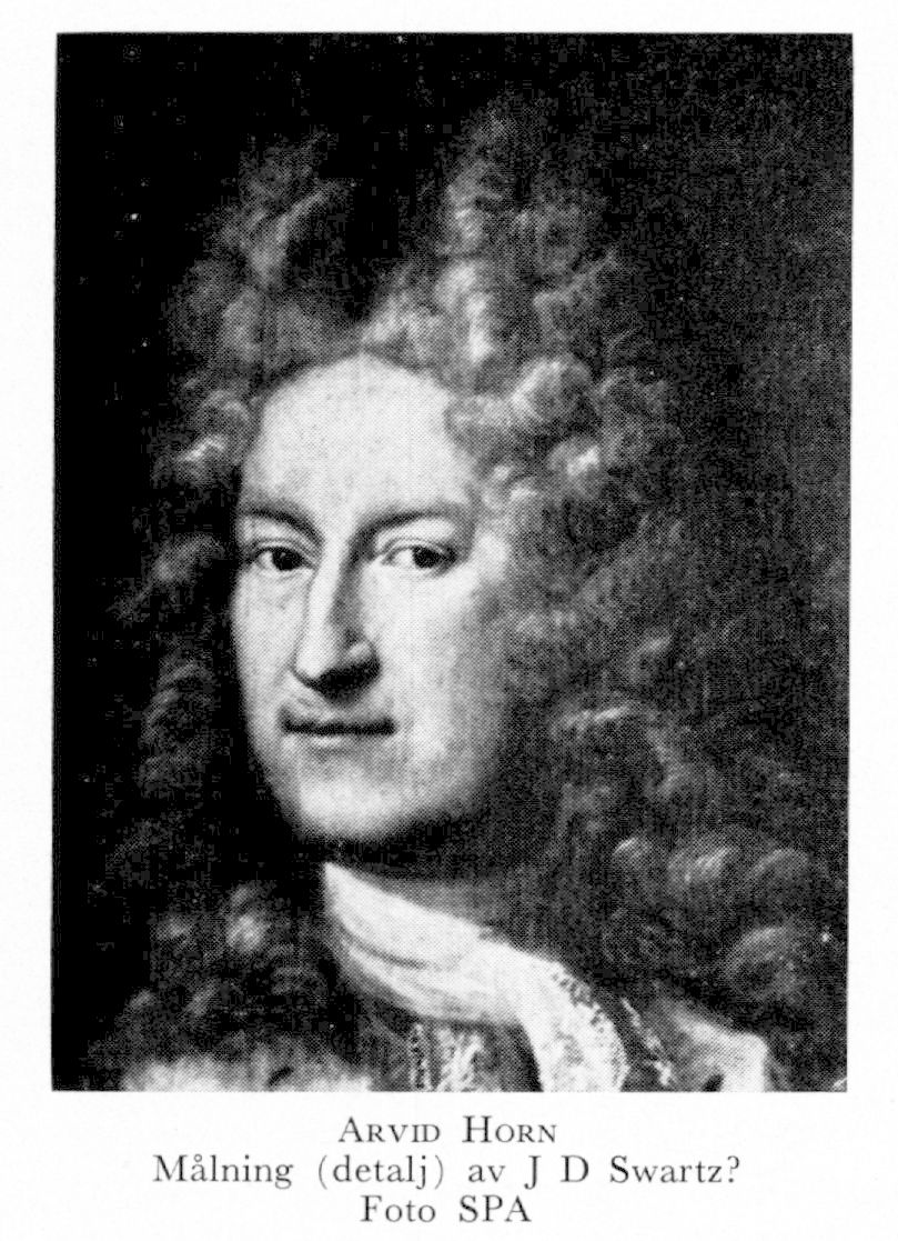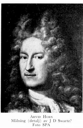 10 Horn, Arvid Bernhard (Arwedh Berendt), f 6 april 1664 på Vuorentaka, Halikko sn, Åbo o Björneb, d 18 april 1742 på Ekebyholm, Rimbo, Sth. Föräldrar: översten Gustav H o Anna Helena v Gertten. Volontär vid Livg 9 aug 82, sergeant där 3 juli 83, fänrik 7 mars 85, löjtn 26 maj 88, kapten 31 dec 93, kaptenlöjtn vid Livdrabantkåren 7 febr 96, dess chef o tillika generalmajor av kavalleriet 18 juli 00, frih s d, generallöjtn av kavalleriet 11 jan 04, kommissarie vid generalkonfederationen i Warszawa 04 (instr 16 jan), ambassadör vid fredsunderhandlingen med Polen 04 (instr 15 juli), k råd o kansliråd 27 dec 05, led av justitierevisionen o defensionskommissionen 7 juni 06, kansler för akad i Pernau s d, greve 27 juni 06, guvernör för hertig Karl Fredrik av Holstein-Gottorp 13 febr 07, kanslipresident 21 mars 10, entledigad från riksråds- o kanslipresidentsämbetena 10 april 19, lantmarskalk 20, ånyo riksråd o kanslipresident 26 april 20, kansler för Åbo akad 5 nov 23, lantmarskalk 26 o 31, nedlade sina ämbeten 38 (avskedsansökan 18 dec).