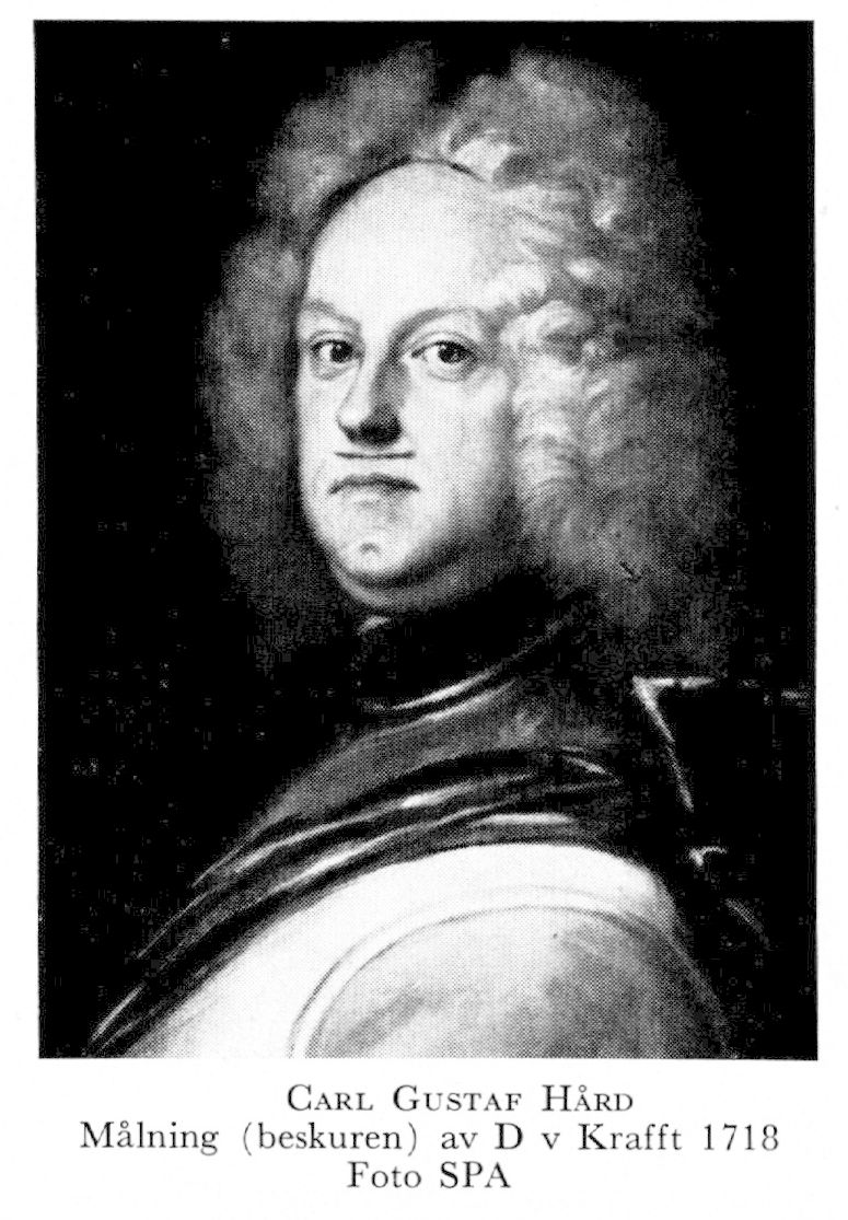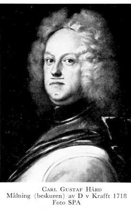 1 Hård, Carl Gustaf, f 11 juni 1674 i S Fågelås, Skar, d 10 febr 1744 i Stora Herrestad, Malm. Föräldrar: generallöjtn o landsh Johan H o frih Karin Stake. Inskr vid LU 1 nov 84, fänrik vid livg 7 febr 96, livdrabant 5 juni 00, korpral vid Livdrabantkåren 14 sept 00, generaladj av kavalleriet 12 dec 03, överste för Västgöta ståndsdragonreg 11 juni 06, löjtn vid livdrabantkåren 8 nov 06, kaptenlöjtn vid livdrabantkåren o generalmajor av kavalleriet 31 jan 10, frih 10 okt 10, generallöjtn 27 mars 13, general av kavalleriet 21 maj 17, guvernör över Skåne 28 juni 17, landsh i Malmöhus län (efter guvernementets deln) 9 maj 19, deltog i riksdagarna 19—26, riksråd 31 juli 27, greve 14 juni 31, licentierad som riksråd 26 mars 39.