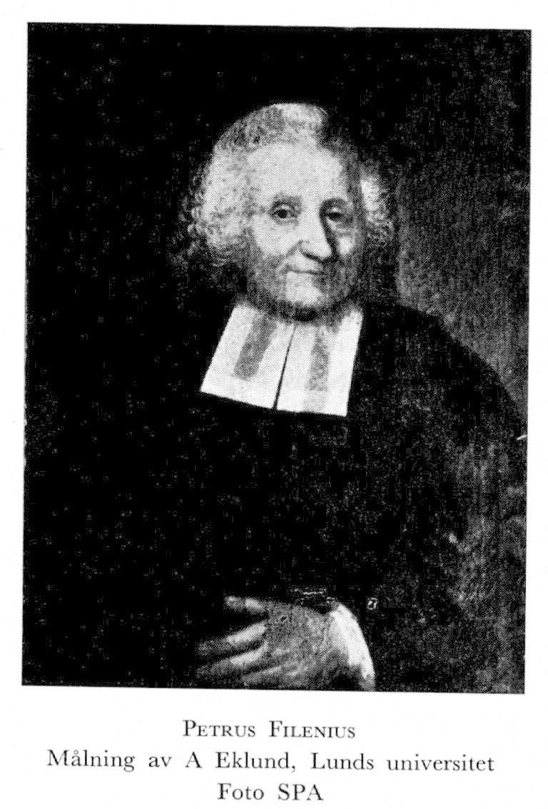1 Filenius, Perrus Nicolaus, f 26 april 1704 i Röddinge sn (Malm), d. 2 juni 1780 i Linköping. Föräldrar: kyrkoh Petrus Filenius o Judith Dorothea Winqvist. Student vid Lunds univ 15 maj 1721, disp pro gradu där 23 nov 1727, fil mag 19 juni 1730, filosofie adjunkt vid Åbo akad 11 maj 1731, tillika akad:s sekr 29 jan 1732, prof i österl språk där 23 april 1735, student vid Oxfords univ 11 nov 1736, studerade i England till 1739, prästv 9 juni 1740, teol dr i Åbo 15 juli s å, 3:e teol prof där med Nådendal, Reso o Merimasku som prebenden 26 maj 1741, rector magnificus 9 juli 1742, prof i österl o grek språken vid Lunds univ 28 okt s å, domprost i Linköping 1 maj 1744, biskop i Linköping 8 sept 1761, led av prästeståndet vid samtliga riksdagar 1746–72, prästeståndets talman en del av riksdagen 1761, nästan hela riksdagen 1765–66 samt riksdagen 1769–70, led av sekreta utskottet o ecklesiastikdeputationen. – Led av Royal Society 1737, led av Society of Antiquaries i London.