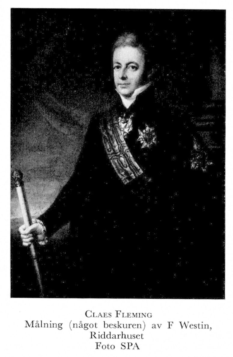 15 Fleming, Claes Adolph, brorsons son till F 14, f 25 april 1771 på Lydinge, Stavby sn (Upps), d 12 maj 1831 i Sthlm (Hovf). Föräldrar: hovmarskalken frih Johan Casimir F o grev Florentina Henriette Hamilton. Inskr vid Uppsala univ 13 okt 1786, fänrik vid livgardet 8 mars 1782, löjtn där 6 dec 1787, avsked 12 mars 1790, kavaljer hos hertiginnan av Södermanland 19 maj 1794, överstekammarjunkare 2 nov 1795, medföljde Gustav IV Adolf på resan till S:t Petersburg 1796, revisor över riksdiskontverket 1809, lantmarskalk vid urtima riksd i Örebro 1810, statsråd 19 nov 1810–26 okt 1824, ordf i överstyr över Strömsholm 11 juli 1813, erhöll överins över Riddarholmskyrkans reparation 11 jan 1814, en av rikets herrar 20 febr s å, led av Serafimerlasarettsdir 28 april s å, greve 11 maj 1818, riksmarskalk från 7 okt 1824, tillika pres i kammarrätten 26 okt s å. Led av riddersk o adeln vid 1800 års riksdag, LSA 1799, RNO 1800, KNO 1809, LVHAA 1810, RoKav-KMO s å (överskattm 1816, kansler 1818–30), LFrKA 1810, RGXIILsO 1811, Hed-LLA 1812, LSkS 1816 (ordf 1822, 1827–31), HedLViS 1821, LVA 1824 (preses 1828–29). – Ogift.
