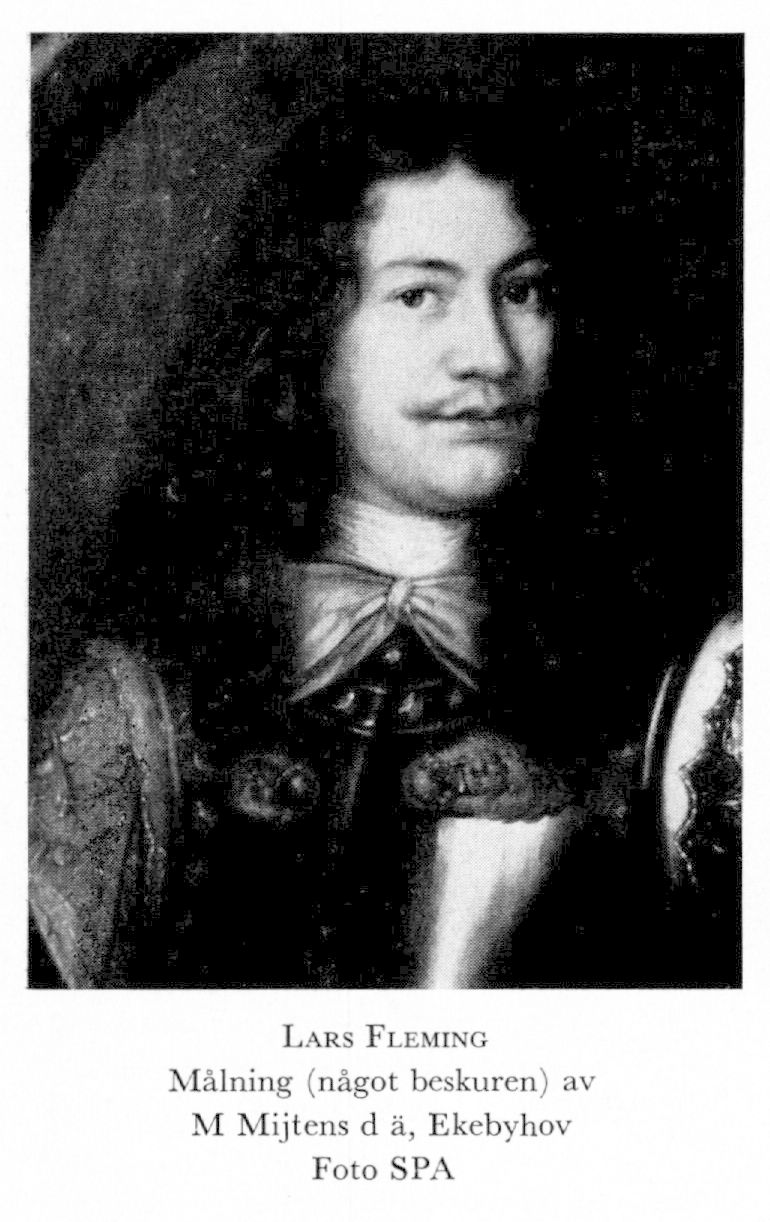 11 Fleming, Lars (Klasson), bror till F 10 och F 12, f 3 jan 1621 (enl huvudbanér i Värmdö kyrka) på Norrnäs, Värmdö sn (Sth), d 9 mars (själaringn 10) 1699 i Sthlm (Jak) o begr i Värmdö kyrka. Inskr vid Uppsala univ 26 maj 1637, kammarråd 10 jan 1651, frih 26 mars s å, landsh i Sthlms län 25 juni 1652, tillika i Uppsala län 27 febr 1654, landsh i Dorpatska kretsen i Livland 11 aug s å, krigskammarpres 6 juni 1657 (PM 6 sept), pres i Dorpats hovr 10 mars 1665, riksråd 21 aug 1668, kansler vid akad i Pernau 25 nov 1669, rikskammarråd 6 juli 1676, tillika tf pres i kommerskoll 23 april 1679, lagman i Söderfinne lagsaga 14 sept 1680, vilken tjänst han dock ej tillträdde, åter hovrättspres i Dorpat 10 febr 1681–22 aug 1695.