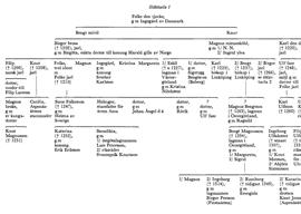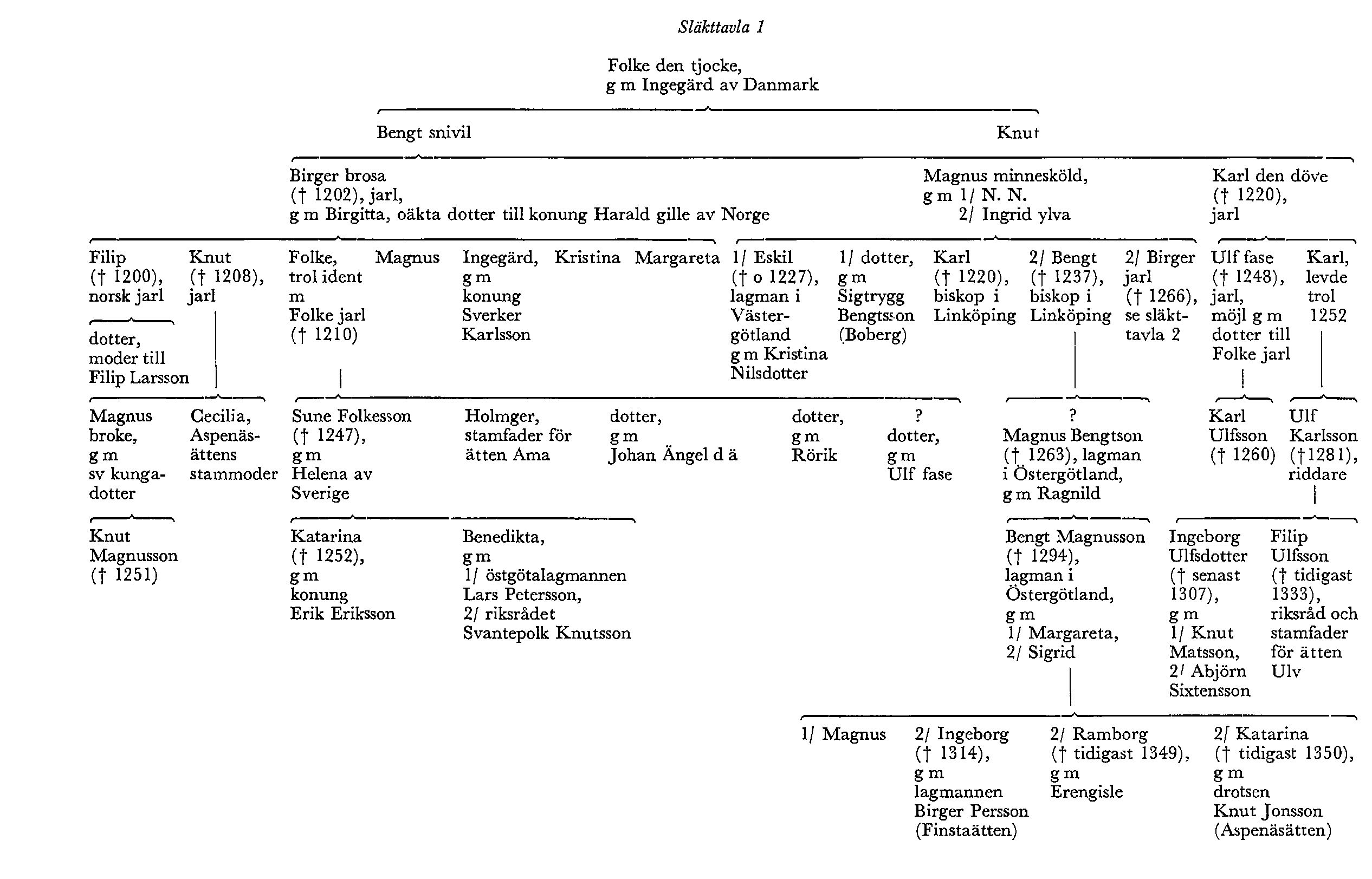 A Konungarna Knut Erikssons och Sverker Karlssons jarl Birger brosa (d 1202; se bd 4, s 415 ff; dödsdagen kan numera, som G Carlsson påpekade 1954, tack vare ett psalterium i British Museum fastställas till 9 jan) hade enligt Heimskringla i äktenskap med Birgitta, illegitim dotter till den norske konungen Harald gille och änka efter den svenske konungen Magnus Henriksson, sönerna Filip jarl, Knut jarl, Folke och Magnus samt döttrarna Ingegärd, Kristina och Margareta, av vilka Kristina ej nämnes i andra källor, medan Magnus och Margareta i övrigt blott är kända från psalteriet. Ingegärd var enligt Fagrskinna, Heimskringla och Knytlingasaga g m den svenske konungen Sverker Karlsson. Filip stupade såsom jarl hos konung Sverre i Norge redan år 1200 (3 jan enligt Sverresagan men 8 jan enligt psalteriet) och var enligt Hakonarsagan morfar till en Filip Larsson, som gifte sig med den svenske konungen Knut långes änka. Birger brosas son Knut var konung Erik Knutssons jarl (Grandinson, Tunberg) och hade enligt psalteriet dödsdagen 31 jan. Troligen stupade han i slaget vid Lena, som enligt flera annaler stod just denna dag 1208. Hans dotter Cecilia var moder (Liljeholm 1952, S Carlsson 1953) till de 1280 för sitt uppror mot konung Magnus ladulås avrättade stormännen Johan och Birger Filipsson (Aspenäsätten). Enligt Hakonarsagan hade Knut jarl sonen Magnus broke, som i äktenskap med konung Knut Erikssons dotter Sigrid (enligt en svensk annal konung Erik Knutssons dotter Katarina) blev fader till den 1251 av Birger jarl avrättade upprorsmannen Knut Magnusson. Av S Carlsson sammanställda indicier tyder på att Birger brosas tredje son är identisk med den ovannämnde, 1210 vid Gestilren stupade jarlen Folke. Dennes son Sune Folkesson gifte sig med konung Sverker Karlssons dotter Helena och dog 1247, efterlämnande döttrarna Katarina, död 1252 såsom änka efter konung Erik Eriksson, och Benedikta, som blev gift först med östgötalagmannen Lars Petersson och sedan med den till en illegitim gren av det danska kungahuset hörande svenske stormannen Svantepolk Knutsson. En annan son till Folke jarl var den i livet senast 1254 uppträdande Holmger Folkesson, som blev stamfar för ätten Ama (utdöd omkr 1360). Såsom Liljeholm 1952 och S Carlsson 1953 visat, hade Folke jarl även döttrar, av vilka en blev stammoder för den bekanta stormannaätten Ängel och en farmor till riksrådet Rörik Birgersson, varjämte Carlsson sökt lösa ett arvsrättsligt problem genom att antaga, att en tredje dotter var g m jarlen Ulf fase (se nedan).