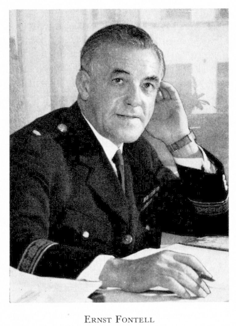 Fontell, Ernst, f 3 maj 1890 i Kristianstad, d 20 maj 1960 i Gbg (Domk). Föräldrar: lantbrukaren Magnus Svensson o Cecilia Wulff. Mogenhetsex i Kristianstad 11 juni 1909, inskr vid Lunds univ 25 sept s å, jur kand 27 maj 1914 där, e o notarie vid hovrätten över Skåne o Blekinge 10 juli s å, vid Svea hovrätt 21 maj 1915, tingstjänstgöring 1915–17, bitr länsnotarie i Jämtlands län 1916, sekr hos Jämtlands läns landsting 16 nov 1917–1 febr 1932, länsnotarie 20 dec 1917, auditör vid Norrlands artillerireg o Jämtlands fältjägarreg 1921–31, vid fjärde flygkåren 1926–31, stadsfullm i Östersund 1 jan 1923–1 febr 1932, led av Jämtlands läns poliskoll 1926–31, lärare vid kurser i kriminalteknik i Sthlm 1930–31, länsassessor i Jämtlands län 23 jan 1931, polismästare i Gbg 1 febr 1932–55, luftskydds- o civilförsvarschef i Gbg 1936–52, övervakningschef för västra distr 1939–46, sakk bl a rör landsfogdetjänsterna 1934, polisradioväsendet 1942 o polisutbildningen 1948. – RVO 1933, RNO 1941, KVO 1948, innehade även utl ordnar.