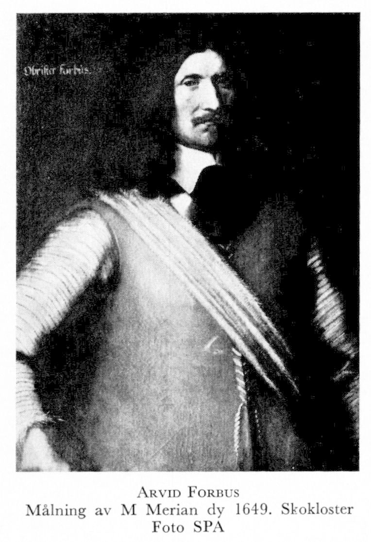 Forbus, Arvid, f 15 juni 1598, trol på Ånäs i Borgå sn, Nyland, d 29 maj 1665 i Stettin. Föräldrar: tullnären i Borgå Enevald Forbes o Karin Matsdtr (Björnram). Löjtn vid Ernst Creutz' reg (Östra Nylands inf:reg) 1623, kapten vid R Metstakes reg (Björneborgs reg) 1626, överstelöjtn där 22 maj 1630, överste o chef för ett värvat reg på 1630-talet, i varje fall fr o m våren 1635, naturaliserad sv adelsman (Forbes) jämte sin bror Mattias 1638, överste för ett värvat reg i Wismar 9 april 1641, kommendant i Stralsund 22 maj s å o tillika överkommendant i Vorpommern 10 aug (fullm 13 aug) s å, erhöll uppdrag att jämte A Erskein o J Hallenus underhandla med Stralsund 1641 (fullm 12 okt), överste för Västerbottens reg 19 april 1642, gen:major av inf 28 maj 1646, v guvernör i Pommern 8 april 1648–17 juni 1653, kommiss:e vid pommerska gränstraktaten 1650–53, frih (Forbus) 4 juni 1652, riksråd 3 okt 1653 o torde samtidigt blivit krigsråd samt tog säte o stämma i krigskoll nov s å, general av inf 7 nov 1658.