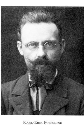 Forsslund, Karl-Erik, f 14 sept 1872 i Ljusnarsberg (Ör), d 14 aug 1941 på Storgården, Ludvika landsförs (Kopp). Föräldrar: grosshandl Carl Fredrik F o Augusta Christina Öhman. Mogenhetsex i Örebro 1889, inskr vid Uppsala univ 22 nov s å, fil lic där 29 maj 1897, fil hedersdr i Uppsala 16 sept 1927, red:sekr i Strix 1897–98, lärare vid Brunnsviks folkhögskola 1906, förest där 1907–12, styr:led vid folkhögskolan från 1906 (sekr 1907–12), styr:led i Dalarnas hembygdsförb, v ordf i Dalarnas fornminnes- o hembygdsförb 1930, ordf i Ludvikabygdens fornminnes- o hembygdsfören, styr:led i Sv naturskyddsfören 1917–27. – RNO 1932, Nord mus:s GM för hembygdsvårdande gärning 1941.