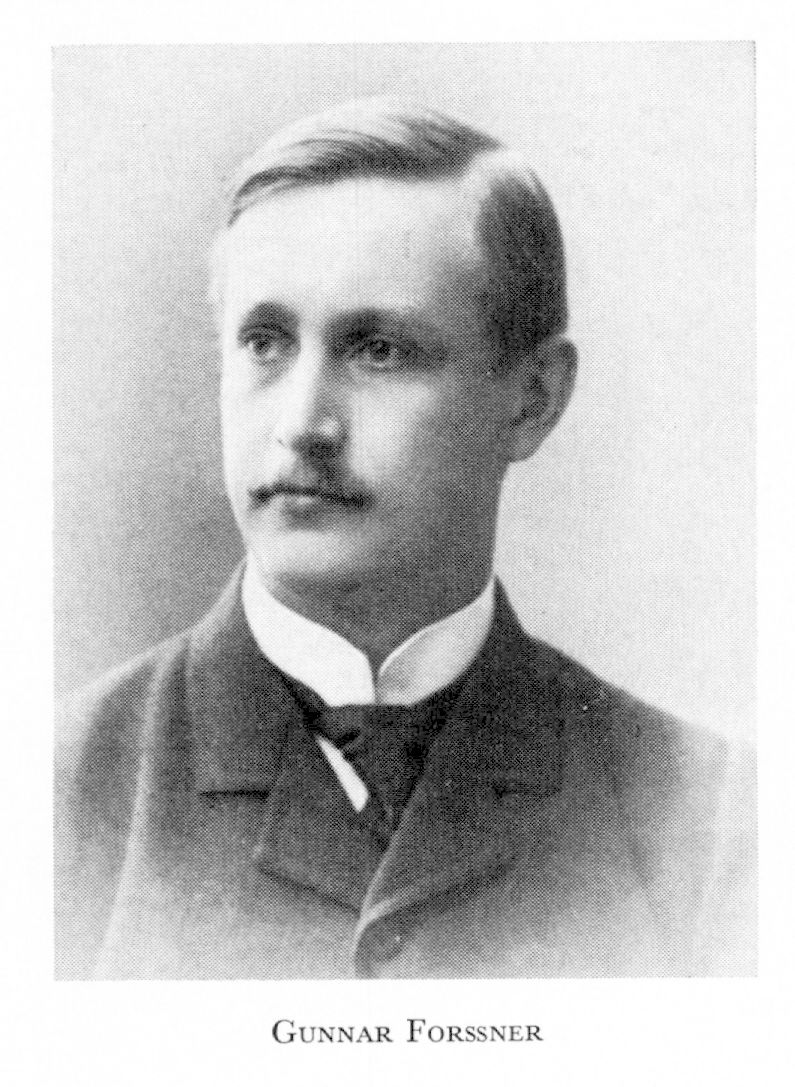 3 Forssner, Gunnar Hjalmar, bror till F 1 o F 2, f 19 maj 1876 i Sthlm (Klara), d 12 jan 1915 i Rättvik (Kopp; enl dödbok för Domk, Uppsala). Mogenhetsex vid N latinlärov i Sthlm 17 maj 1893, med fil ex vid Uppsala univ 30 maj 1894, amanuens vid Karol inst:s anatomiska institution sept 1896–sept 1898, med kand vid Karol inst 14 maj 1898, amanuens vid patol institutionen där sept 1899–sept 1901, disp vid Lunds univ 21 mars 1903, assistent vid patol institutionen i Lund april 1903–aug 1904, med lic där 14 dec 1903, doc i experimentell patologi där febr 1904–nov 1905, med dr 30 maj 1904, doc i allm patologi vid Karol inst dec 1905–nov 1909, företog 1905–09 flera studieresor till kliniker i Tyskland o England, underläk vid Serafimerlasarettets med klinik juni 1905–maj 1906, amanuens vid med polikliniken där juni–dec 1906, underläk på Kronprinsessan Lovisas vårdanstalts med avd jan–okt 1907, amanuens på Allm barnhuset okt–dec s å, klinisk laborator vid Karol inst 1 dec 1909, prof i pediatrik o praktisk medicin vid Uppsala univ 24 mars 1911, prof i praktisk medicin där 11 okt 1912.