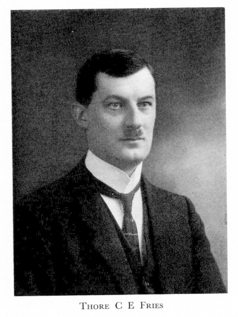 3 Fries, Thore Christian Elias, son till F 2, f 2 nov 1886 i Uppsala (Domk), d 31 dec 1930 i Umtali, Rhodesia (enl dödbok för Domk, Lund). Mogenhetsex vid Uppsala h allm lärov 30 maj 1905, inskr vid Uppsala univ 30 aug s å, fil kand 15 dec 1908, amanuens vid Uppsala univ:s botan laboratorium 1911–12, lär vid Fjellstedtska skolan i Uppsala 1911–13, fil lic 3 april 1912, disp pro gradu 3 maj 1913, fil dr 31 maj s å, doc i växtbiologi 19 sept s å, allt i Uppsala, led av sv-norska renbeteskommissionen 1913–16, vid flera tillfällen inkallad som sakk vid förhandhna mellan Sverige o Norge om renbetessaken 1917–19, förest för Abisko naturvetensk station 1 maj 1917–20 okt 1921, konservator vid Uppsala univ:s botan mus 8 april 1920–24 april 1924, doc i botanik vid Uppsala univ 14 febr 1924, prof i samma ämne vid Lunds univ 3 juni 1927. – LFS 1927.