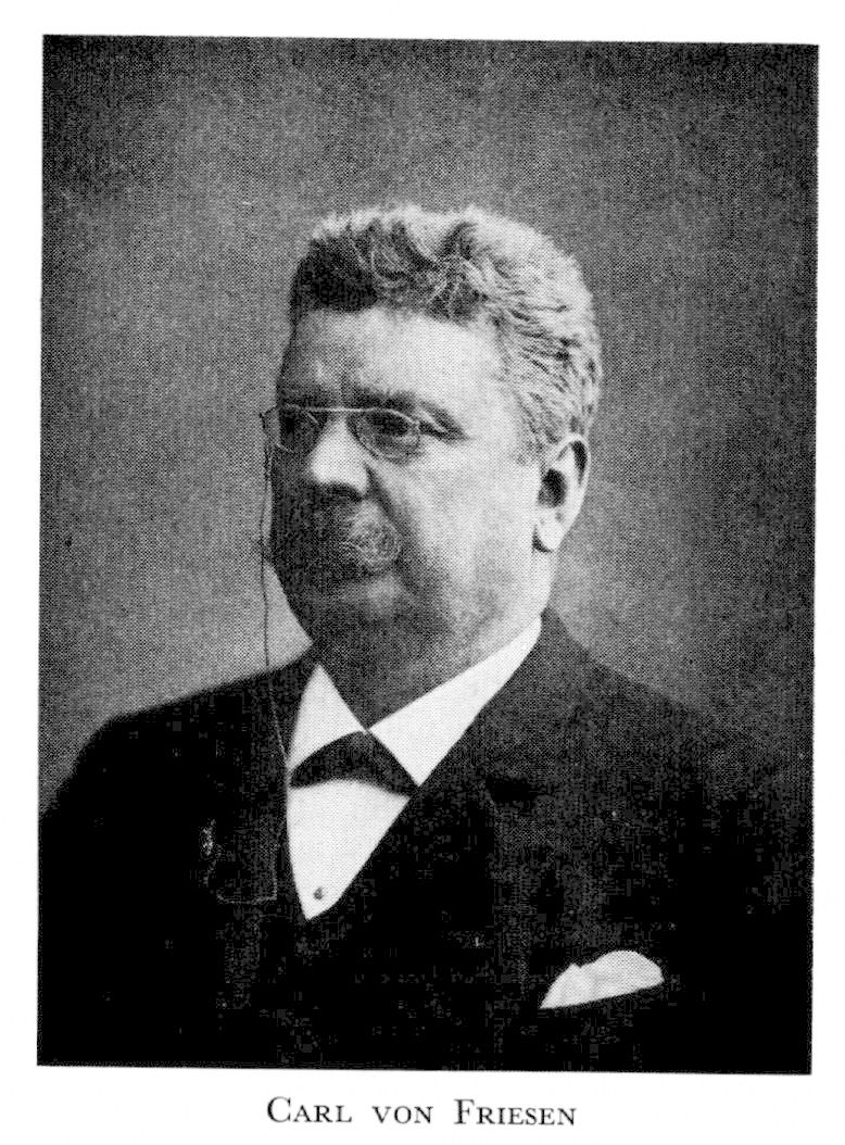 1 von Friesen, Carl Sebastian, f 10 sept 1846 i Hökhuvud (Sth), d 10 juni 1905 i Sthlm (Maria). Föräldrar: kontraktsprosten Fredrik v F o Justina Elisabet Brolin. Elev vid katedralskolan i Uppsala 1854–63, studentex vid Uppsala univ 7 maj 1863, fil kand 30 jan 1868, disp pro gradu 26 maj 1869, fil dr 31 maj s å, allt i Uppsala, eo kanslist i ED 1868, uppehöll rektors undervisn vid Katarina lägre elementarlärov i Sthlm vt 1868, extra lär o vik lektor vid Sthlms gymnasium nov 1868–vt 1872, eo lektor där 1872–79, sekr i kommittén för ämbetsex för blivande lärov:lär 1877–78, lektor i latin, grekiska o modersmålet vid Södermalms h latinlärov 11 juni 1879 (tilltr 1 aug så)–30 juni 1884, bitr rektor där vt 1881 o vt 1882, ledare för teoretiska provårskursen vid de allm lärov i Sthlm 1881–86, sekr i 1882 års lärov:kommitté 1882–84, rektor vid nämnda lärov 1 juli 1884–31 dec 1902, led av överstyr för Sthlms stads folkskolor 1885–90, led av Sthlms stadsfullm 1888–1902, led av dir över inst för blinda 1889–99, av dir över Sthlms stads undervisningsverk 1891–1902 o av Sthlms drätselnämnd 1892–1902, ordf i kommittén för bl a lärarprovens inskränkande 1897–98, led av FK fr o m 1897 (tillf utsk 1898–99, 1900 o 1902, särsk utsk 1899, suppl i statsutsk 1901 o 1902), v ordf i 1899 års lärov: kommitté 1899–1902, statsråd och chef för (ED från 5 juli 1902. — RNO 1891, KNO1kl 1903.