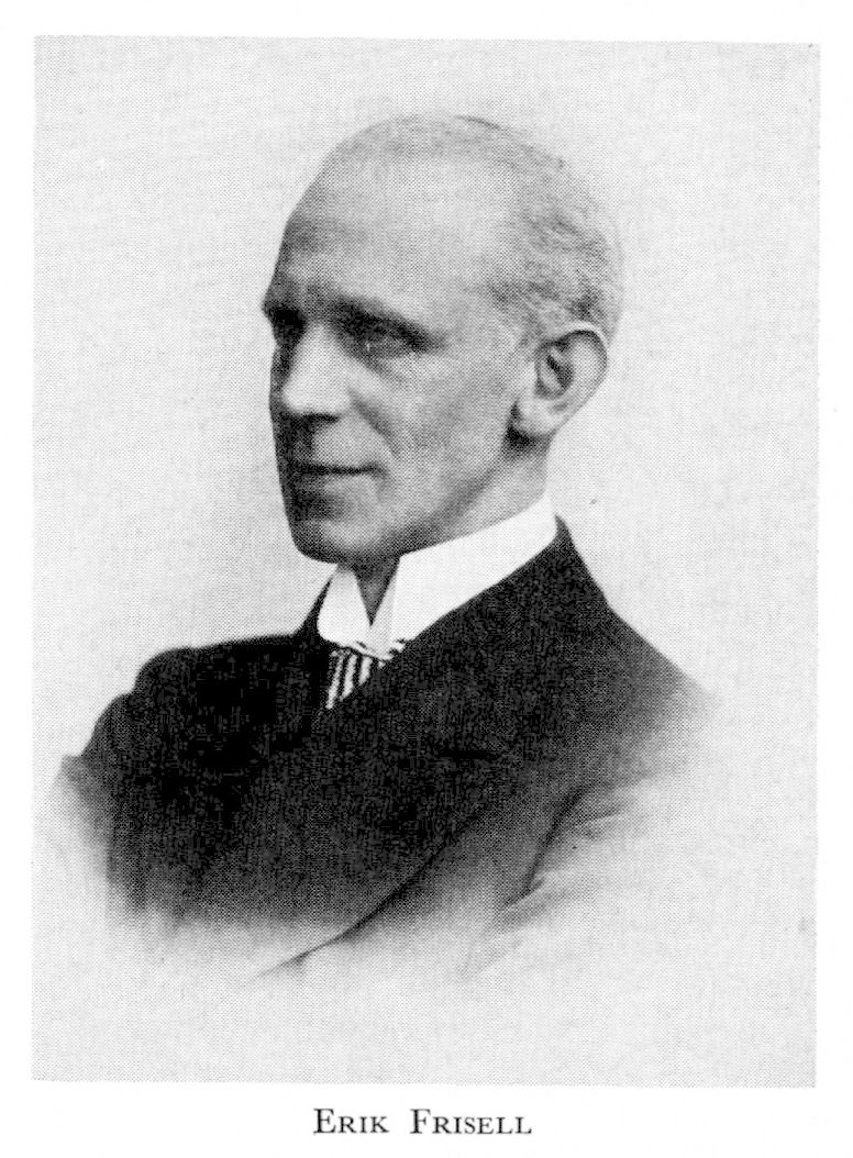 Frisell, Erik, f 24 (enl födelsebok 4) jan 1859 i Gbg (Domk), d 22 febr 1942 i Sthlm (Engelbr). Föräldrar: direktören Henning Erik F o Alfhild Eugenia Lindberg. Mogenhetsex vid Schillerska skolan i Gbg 29 maj 1878, student i Uppsala 16 sept 1878–april 1879, bank- o handelsstudier i Tyskland, England o Frankrike 1879, banktjänsteman vid Skandinaviska kreditab i Gbg 1880, styr:suppl i ab D Carnegie & Co där 1890, i Sockerfabriksab Union, Hasslarp (Malm) 1897, kontorschef i ab D Carnegie & Co 1899, verkst dir för dess kommersiella avd 1900–07, led av styr för Roma sockerfabriksab (Gotl), för Praktiska hushållsskolan i Gbg från 1901, för Skandinaviska kreditab 1902–19, för Trollhätte kanal- o vattenverk från 1905, av dess efterföljare K Vattenfallsstyr 1908–13, av styr för Trafikab Grängesberg–Oxelösund o Luossavaara–Kiirunavaara ab 1906–36, Fastighetsab D Carnegie & Co 1907–20 o 1925–39, Sv sockerfabriksab 1907–39, Oxelösund–Flen–Västmanlands järnvägsab 1908–19, Örebro–Köpings järnvägsab 1908–19, verkst dir för Trafikab Grängesberg–Oxelösund o Luossavaara–Kiirunavaara ab 1909–16, led av handelsrådet från 1912, av statens industrikommission 1914–17, sakkunnig vid utredn av frågan om rikets ekon krigsberedskap 1915, v ordf i styr för Trafikab Grängesberg–Oxelösund o Luossavaara–Kiirunavaara 1917–20, led av styr för bl a Gällivare malmfält, Grängesbergs grufveab, ab Custodia, Rederiab Luleå–Ofoten. RVO 1906, RNO 1909, KVO2kl 1914, KVO1kl 1916.