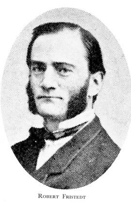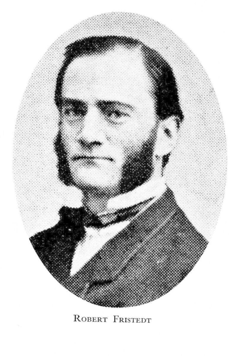 Fristedt, Robert Fredrik, f 19 juni 1832 i Sthlm (Kat), d 16 febr 1893 i Uppsala. Föräldrar: kryddkramhandlaren Gustaf Fredrik F o Kristina Charlotta Vahlberg. Elev vid Maria h lärdomsskola 1842 o vid Sthlms gymnasium 1847, inskr vid Uppsala univ 10 juni 1851, fil kand 30 jan 1856, disp för fil drsgrad 25 febr 1857, fil dr 5 juni s å, med kand 28 sept 1859, med lic 15 maj 1861, Wahlenbergsk amanuens vid farmakol inst 12 okt s å, disp för rned drsgrad 30 nov s å, adjunkt i med naturalhist o kemi 22 jan 1862, med dr 31 maj s å, allt vid Uppsala univ, notarie i med fakulteten vid Uppsala univ jan 1869–sept 1873 samt sept 1874–dec 1877, eo prof i farmakologi o med naturalhist där 16 nov 1877, prefekt för farmakolog inst s å. – LVS 1873, RNO 1887.