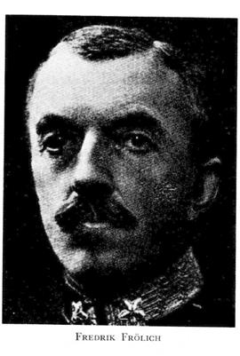 5 Frölich, Fredrik August, f 14 april 1861 på Alebäcks gård, Sävare (Skar), d 10 juli 1933 i Sthlm (Engelbr). Föräldrar: majoren Johan Axel F o Christina Charlotta Tham. Mogenhetsex vid Skara h a l 12 juni 1880, off: ex vid Karlberg 31 okt 1882, underlöjtn vid Västgöta reg 1 dec s å, ex vid krigshögskolan 15 maj 1886, reg:intendentsex 9 nov 1887, löjtn av 2 kl 5 aug 1889, av 1 kl 5 aug 1892, intendent av 2 kl vid intendenturkåren 31 dec 1894, reg: intendent vid Västgöta reg 27 juni 1895–14 dec 1905, kapten där 6 nov 1896–22 dec 1898, intendent av 1 kl vid intendenturkåren 30 dec 1898, fältintendent av 2 gr 15 dec 1905, led av krigsförvaltningskommittén 1909–11, fältintendent av 1 gr 28 april 1911, överfältintendent vid intendenturkåren 22 aug 1913, överste där 23 dec 1914, generalmajor o chef där samt generalintendent o chef för arméförvaltningens intendentsdep 10 april 1915, generallöjtn i armén 26 maj 1922–1 nov 1926. – RVO 1903, LKrVA 1906, RNO 1907, KSO1kl 1916, KVO1kl 1923.