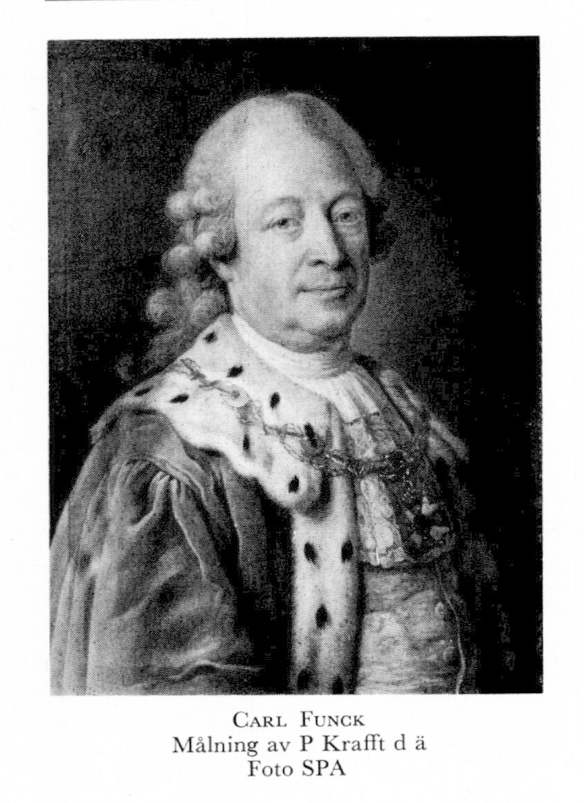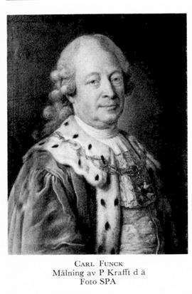 3 Funck, Carl, brorson till F 2, f 1 dec 1708 trol i Sala, d 22 juni 1783 på Hovgården, Hov (ög). Föräldrar: landsh frih Gustaf F o Christina Cronström. Inskr vid Uppsala univ 1 okt 1722, eo kanslist i krigsexp febr 1728, sergeant vid art:reg, Sthlm, 30 april 1730, styckjunkare där 28 jan 1731, underlöjtn 6 sept 1732, löjtn 14 nov 1734, kapten 5 aug 1741, major vid art i Gbg 7 maj 1747, major vid art i Sthlm 27 april 1748, överstelöjtn vid art:bataljonen på Gotland 22 nov 1749, vid art i Finland 28 jan 1758, vid Södermanlands reg 3 juli s å, överste i armén 22 april 1760, överste vid art o förordn som generalfälttygmästare i krigskoll 8 sept 1761, riksråd 11 sept 1765–27 maj 1769 o 27 mars 1772–22 aug s å. Deltog i riksdagarna 1738–39, 1755–66 (led av SU 1765–66). RSO 1748, KmstkSO 1771.