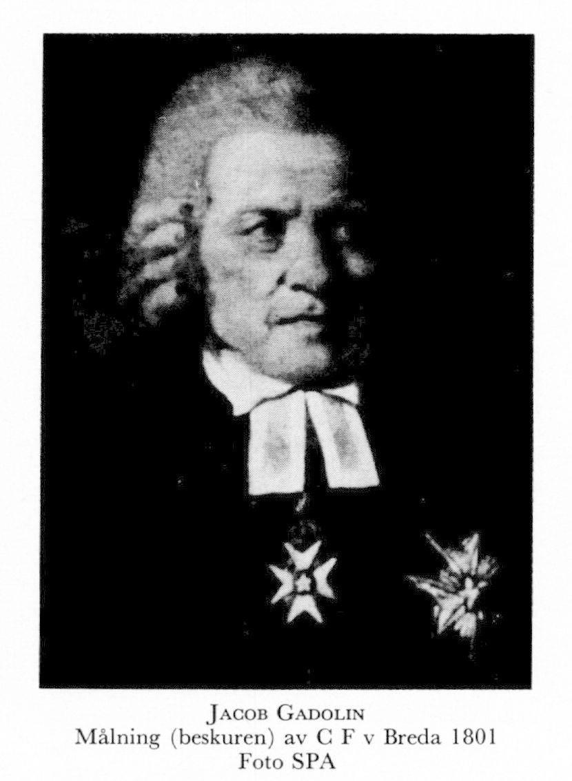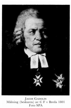 1 Gadolin, Jacob, f 13 okt 1719 i Strängnäs, d 26 sept 1802 i Åbo. Föräldrar: kontraktsprosten Jacob G o Anna Lignipaea. Inskr vid Åbo akad 14 febr 1736, vid Uppsala univ 20 okt 1742, fil kand i Åbo 4 dec 1744, mag 18 juli 1745, doc i matematik s å, tf prof i samma ämne 1745–55, allt i Åbo, astronomie observatör vid lantmäterikommissionen i Finland 1 april 1748, astronomie observatör o eo prof i Åbo 27 okt s å, prästv 24 okt 1752, kh i Finska domk:förs i Åbo s d–1779, prof i fysik där 29 mars 1753, deltog i riksdagarna 1755–56, 1760–62, 1771–72 o samtliga riksdagar 1786–1800 (led av SU 1755–72, 1786–92), inskr vid Greifswalds univ 9 juli 1756, teol dr där 18 okt så, 3:e teol prof i Åbo 17 dec 1762, 2:e prof 23 juli 1765, 1:e prof o domprost där 20 dec 1779, kh i Sv domk:förs där 7 juli 1781, tjänstledig från professuren 4 dec 1784, biskop i Åbo stift o prokansler vid Åbo akad 5 juni 1788, erhöll Töfsala pastorat (Åbo o Björneb) som personl prebende 1789, ordf i Musikal sällsk i Åbo 1794, Finska hushålln: sällsk:s förste ordf 1797. – LVA 1751, LPS 1785, LNO 1786, KNO 1789.