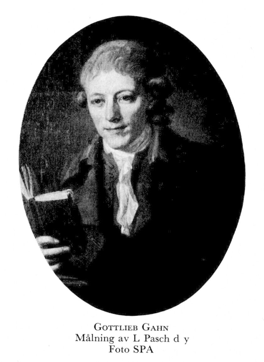 1 Gahn, Johan Gottlieb, f 19 aug 1745 på Voxna bruk, Ovanåker (Gävl), d 8 dec 1818 i Falun. Föräldrar: lanträntmästaren Hans Jacob G o Anna Maria Schulzen. Inskr vid Uppsala univ 19 febr 1754, gymnasist i Västerås 1758, studerade i Uppsala 1762–70, auskultant i bergskoll 22 dec 1768, bergsex i Uppsala 1770, stipendiat i kemi 3 dec 1773–2 juni 1814, bergmästares titel 16 maj 1782, revisor i riksbanken s å, assessor i bergskoll 30 april 1784, led av rikets allm ärenders beredn 19 april 1793, deltog i riksdagarna 1778–79, 1809–10 (led av bevilln:utsk o konstitutionsutsk) o 1810 (led av konstitutionsutsk). – Bergskoll:s GM 1780, LVA 1784, LLA 1812.