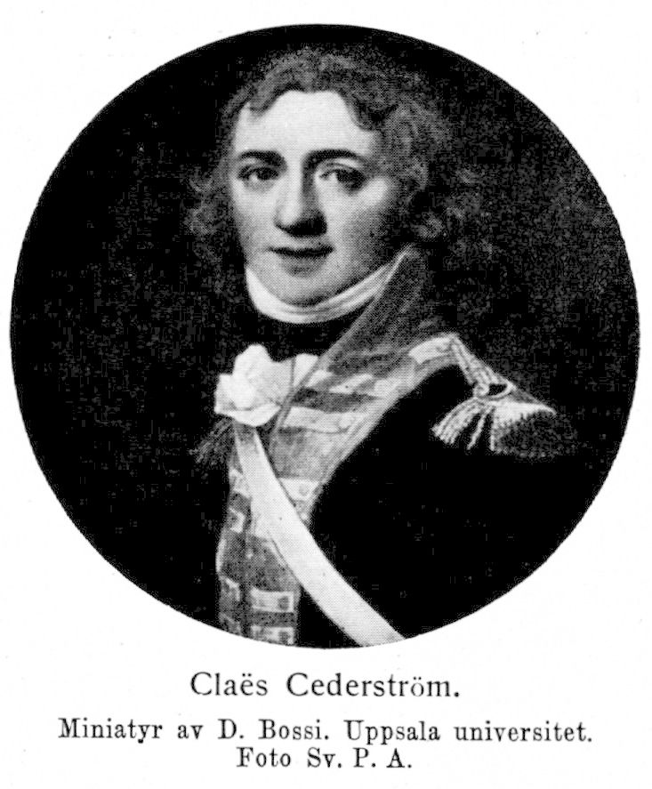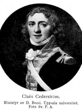 5. Claes Cederström, senare Claesson, den föregåendes broder, f. 3 sept. 1772 i Huddinge socken, d 8 mars 1840 i Skänninge. Antagen i krigstjänst 1782; fänrik utan lön vid Svea livgarde 22 apr. 1782; avlade officersexamen 1788; löjtnant vid livgardet 29 jan. 1788; förrättade adjutantstjänst juli 1790; stabskapten 13 maj 1795; permitterad på sex månader från 1 juli 1798; erhöll avsked '22 jan. 1799; deltog i riksdagen i Norrköping 1800; avsade sig adelskapet 29 maj 1800 och kallade sig sedermera Claesson; ledamot av Uppsala läns hushållningssällskaps förvaltningsutskott 1814—30; adjutant hos konungen och överstelöjtnant i armén 2 nov. 1819; överste i armén 24 aug. 1824; erhöll avsked från adjutantsysslan 1828. RSO 1821.