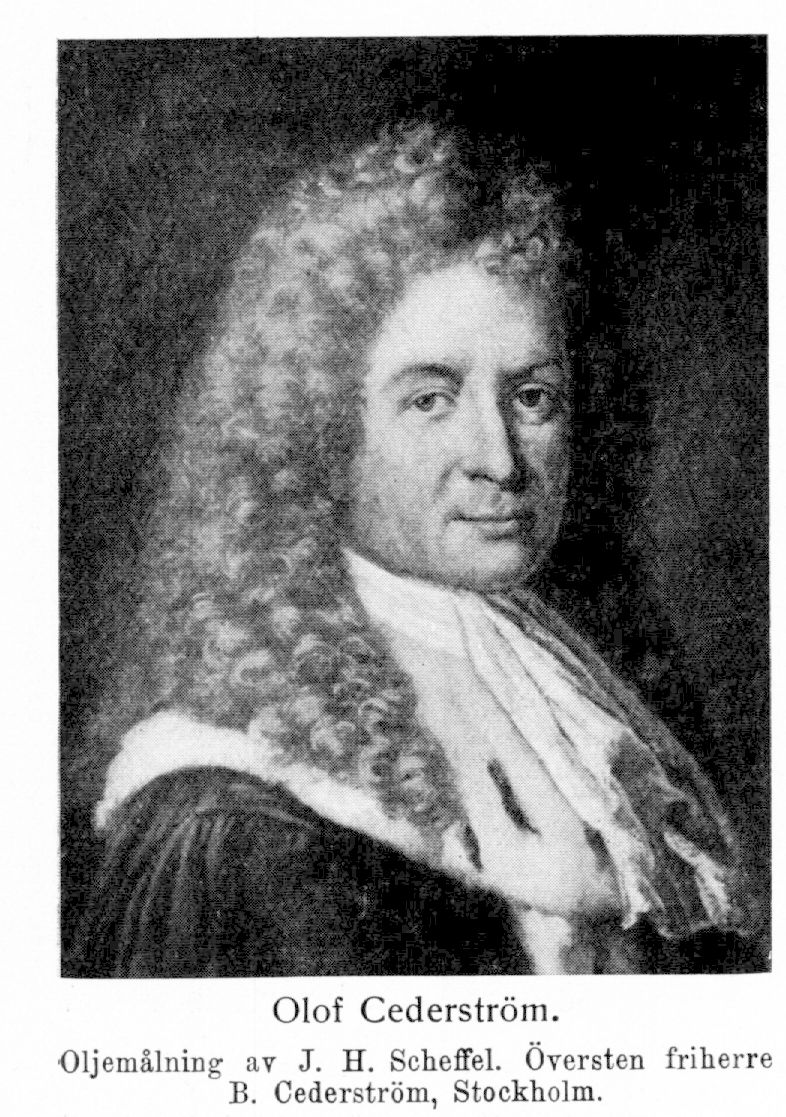 1. Olof Cederström, före adlandet Carlsson, friherre till Beatelund och Lisma, f. 28 sept. 1679 i Stockholm, d 20 mars 1745 därstädes. Föräldrar: pastor primarius, sedermera biskopen i Västerås Carl Carlsson och Margareta Svebilia, adlad Adlerberg. Adlad för faderns förtjänster 8 aug. 1684; student i Uppsala 10 mars 1693; bevistade riksdagen 1697; företog en utrikes studieresa 1699 (pass 19 juli) —1705; e. o. kanslist i K. kansliet 1705; auskultant i riksarkivet 24 febr. 1705; kanslist vid tyska expeditionen 10 sept. 1707, vid utrikesexpeditionen 11 febr. 1710 och vid inrikesexpeditionen 16 nov. 1711; registrator därstädes 2 jan. 1714; expeditionssekreterare 24 okt. 1716; bevistade riksdagarna 1719 —39 och var därunder bl. a. ledamot av sekreta utskottet 1719 och 1720, av dess deputation över kansliordningen och ämbetsederna 1719, av stats- och defensionsdeputationen 1720, av deputationen över riddarhusordningen 1720, 1723, 1731 och 1734, av deputationen över propositionen rörande Fredrik I: s upphöjelse till konung 1720, av deputationen över rådsprotokollen 1723, av deputationen över sekreta utskottets instruktion 1723, av deputationen till expeditionernas justerande 1723, av deputationen angående de civila tjänsterna 1723, av deputationen över tvister om sätena å riddarhuset 1723, av sekreta deputationen 1726 och av deputationen över konspirationssaken 1726, elektor vid rådsvalet 1726 samt ledamot av instruktionsdeputationen 1734; e. o. kansliråd 10 jan. 1721; ledamot av kommissionen över upphandlingsdeputationen 31 jan. 1721—18 jan. 1724, av deputerade över kommerskollegiets förslag till pestplakat 20 nov.—7 dec. 1721, av kommissionen över J. F. Osthoff m. fl. 11 maj 1723—27 nov. 1724, av ecklesiastikdeputationen 17 okt. 1723 och av politi- och brandkommissionen i Stockholm 6 maj 1724—3 juli 1739; kansliråd 30 aug. 1727; statssekreterare i inrikes civilexpeditionen 9 jan. 1728; friherre 5 juli 1731; riksråd 26 mars 1739; kansler för Åbo akademi 29 okt. 1739; ordförande i kommissionen angående kammarverkets förbättrande 20 okt. 1741, i lagkommissionen 1742, i kommissionen angående Finlands upphjälpande 9 maj 1743 och i kommissionen angående järnhandeln 2 nov. 1743.