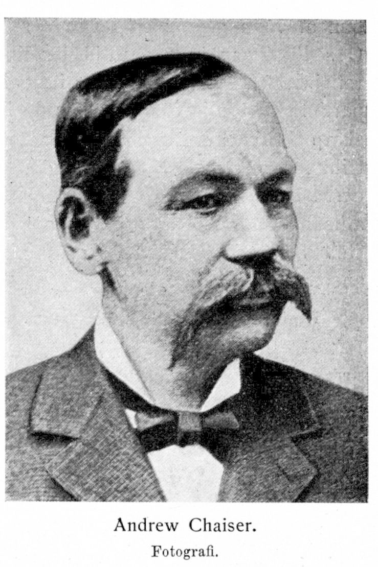 Chaiser, Andrew, f. 5 ang. 1841 i Bälinge församling, Uppsala ärkestift, d 31 mars 1899 i Chicago. Flyttade med sina föräldrar till Bishop Hill, Ill., 1850; elev i public school därstädes; sättarlärling hos tidningen Den swenske republikanen i norra Amerika i Galva 1856—dec. 1857; utgav under samarbete med andra journalister (jfr nedan) The Illinois Swede i Galva 21 juli 1869—28 okt. 1870, Nya verlden i Galva 4 nov. 1870—12 jan. 1871, i Chicago 20 jan.—5 okt. 1871, till följd av Chicagobranden i Galesburg 14 okt. 1871—7 mars 1872 och ånyo i Chicago 16 mars 1872—14 sept. 1877 samt Svenska tribunen i Chicago från 20 sept. 1877; v. president i det bolag, som ägde Svenska tribunen, 1877— 82 och president i samma bolag 1882—90 samt tillika dess affärs-föreståndare 1879—90; så gott som ensam ägare av Svenska tribunen från 1890.