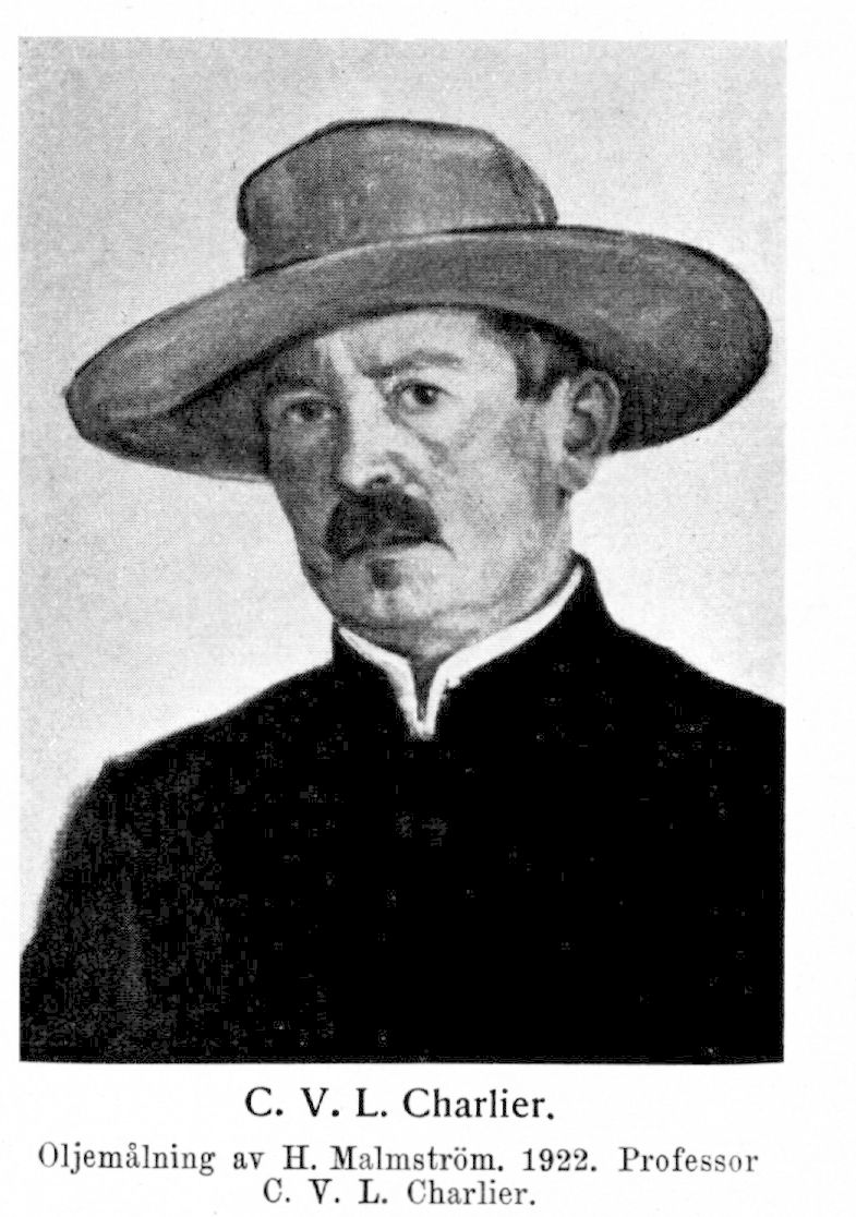 Charlier, Carl Vilhelm Ludvig, f. 1 apr. 1862 i Östersund. Föräldrar: inspektören Emmerich Emanuel Charlier och Aurora Kristina Hollstein. Elev vid Östersunds h. allmänna läroverk vt. 1872; avlade mogenhetsexamen därstädes 28 maj 1880; student i Uppsala 13 sept. 1881; fil. kand. 12 dec. 1882; fil. lic. 13 mars 188.6; disp. 9 mars 1887; fil. doktor 31 maj 1887; studerade vid ryska centralobservatoriet i Pulkova samt i Tyskland, huvudsakligen Berlin, och i Köpenhamn nov. 1887—juni 1888; har företagit ett flertal utländska studieresor, företrädesvis till Tyskland men även till England (1919) och Amerika (1924). Amanuens vid astronomiska observatoriet i Uppsala jan. 1884—okt. 1887; höll populära föreläsningar vid Uppsala arbetarinstitut vt. 1886; genomgick provårskurs vid Uppsala h. allmänna läroverk läsåret 1886 —87; docent i astronomi vid Uppsala universitet 29 mars 1887; amanuens vid Vetenskapsakademiens observatorium i Stockholm sept. 1888—maj 1890; uppförd på andra förslagsrummet till astronomie observatorsbefattningen vid Lunds universitet 26 apr. 1890; astronomie observatör vid Uppsala universitet 21 maj 1890; ledamot av styrelsen för Uppsala nya tidnings a.-b. 1891—96; uppehöll professuren i astronomi vid Uppsala universitet under examensperioderna i maj åren 1893—95; höll populära föreläsningar vid sommarkurserna i Uppsala aug. 1893 och 1895 samt vid Gävle arbetarinstitut vt. 1894; professor i astronomi vid Lunds universitet 23 juli 1897; v. ordförande i kommittén angående ny taxa för personbefordran å statens järnvägar 28 jan.—1 okt. 1898; styrelseledamot i Astronomische gesellschaft 1904—23; Sveriges ombud vid internationella tidkommissionens sammanträde i Paris 1913; censor vid studentexamina sedan 1914; en av stiftarna av samt styrelseledamot i Svenska astronomiska sällskapet 1919; ledamot av Svenska försäkringsföreningen 1919; sakkunnig för utredning angående statliga penninglotterier 25 sept. 1920—10 mars 1922 och studerade i samband med detta uppdrag lotterier i Schweiz,. Frankrike och Holland 1921; professor emeritus 8 apr. 1927. Erhöll av Vetenskapsakademien Ferrnerska priset 1887, av Uppsala universitet halva Bjurzonska belöningen 1887 och av Vetenskapsakademien Wallmarkska belöningen 1888; LFS 1898; LVA 1898; LVS 1914; erhöll av Vetenskapsakademien Wallmarkska belöningen 1917, av Fysiografiska sällskapet i Lund dess minnesmedalj 1924 och av Academy of sciences i Washington Watsonmedaljen 1924; är dessutom ledamot och hedersledamot av ett stort antal utländska lärda sällskap och har erhållit utländska belöningar.