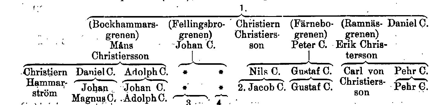 Christier Månssons äldste son A) Måns Christiersson (f. 1628, d 1689) blev liksom fadern borgare i Västerås och bruksidkare. Han ägde Bockhammars bruk i Västmanland och är framför allt bekant som Ljusneverkens egentlige skapare. Sedan privilegium på anläggande av en hammare vid Ljusne (numera Sörljusne) i Söderala socken i Hälsingland 30 nov. 1671 utfärdats för Hans Kalmeter och dennes participant, framträder Måns Christiersson redan 1676 som ägare till bruket (förlängning å frihetsåren 16 nov.) och utvecklade sedan ända till sin död för dettas bästa en livlig verksamhet, som återspeglas i bergskollegiets talrika brev och resolutioner för honom. Ett annat av Ljusneverken, Sunnäs i Skogs socken, har Måns Christierssons initiativ att tacka för sin tillkomst (privilegium 22 dec. 1684), medan de båda övriga, Gullgruva i Skogs socken och Maråker i Söderala socken, uppkommit genom senare hammarflyttningar (1692, resp. 1730). Från Måns Christiersson härstammar släktens äldsta huvudgren, den s. k. Bockhammarsgrenen, som fortlevde till 1823. Bland hans elva barn kunna nämnas a) bruksförvaltaren vid Ljusne Christiern Hammarström (f. 1653, d ogift 1676) samt Daniel och Adolph, som antogo namnet Christiernin och blevo stamfäder för varsin släktgren. Den äldre av de båda sistnämnda bröderna, b) brukspatronen Daniel C. (f. 1664, d 1740), ägde Ljusne och Gullgruva och efterlämnade sonen Johan Magnus C. (f. 1688, d 1742), vilken under åren 1722—35 ägde Sunnäs och därefter kvarstannade på detta bruk som förvaltare till år 1737. En större roll synes ha spelats av Daniel C: s yngre broder c) brukspatronen Adolph G. (f. 1669, d 1743), vilken ägde Bohammar, Västanfors och Fagersta i Västmanland samt det nyssnämnda Sunnäs. Han överlevdes av tvenne söner. Den äldre av dessa, registratorn i justitiekanslersexpeditionen Johan Adolphsson C. (f. 1699, d 1767) förenade i sin hand de fyra Ljusneyerken Ljusne, Sunnäs, Gullgruva och Maråker samt ägde därjämte Mattsbo (Hedemora socken) i österbergslagen, där Gästriklands- och Hälsinglandsverken gärna hämtade malm och tackjärn, och Riksätra i Uppland. Söner till honom voro överjägmästaren Adolph Samuel C. (f. 1735, d 1777), vilken ägde Rastaborg i Uppland, och brukspatronen Eric Daniel C. (f. 1741, d 1806, vilken ägde Kengis och Svansten i Västerbotten. Den yngre av Adolph C:s efterlevande söner, bergsrådet Adolph Adolphsson C. (f. 1700, d barnlös 1771), ärvde Västanfors och Fagersta.