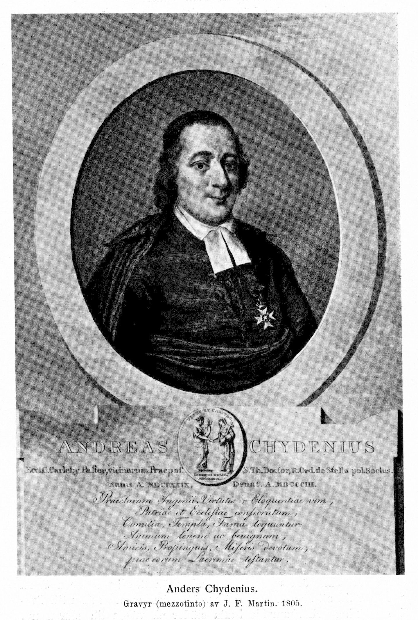 2. Anders Chydenius, den föregåendes broder, f. 26 febr. 1729 i Sotkamo socken i Österbotten, d 1 febr. 1803 i Gamla Karleby. Åtnjöt undervisning i hemmet i Kuusamo i två år, därefter i Uleåborgs trivialskola i två år och slutligen privat av rektorn i Torneå Johan Wigelius 1744—45; student i Åbo 18 febr. 1745 och i Uppsala 9 okt. 1750; disp. i Uppsala 5 juni 1751 (De navigatione per flumina et lacus patriæ promovenda, p.l; pres. S. Chydenius); ånyo student i Åbo vt 1753; fil. kand. i Åbo 1753; disp. i Åbo 26 maj 1753 (Amerikanska näfverbåtar beskrefne; pres. P. Kalm); fil. magister i Åbo 25 juli 1754. Innehade kondition hos hovrättsrådinnan B. Ch. Malm å Vijk i Kimito socken sommaren 1748; prästvigd 24 mars 1753; predikant i Nedervetil 24 mars 1753; kaplan därstädes 1760; riksdagsman 1765—66, 1778—79 och 1792 (valdes därtill även 1769, men valet gick tillbaka), och var därunder bl. a. ledamot av stora deputationen och dess tryckfrihetsutskott, av bevillningsdeputationen, fiskerideputationen och av allmänna besvärsdeputationen 1765—66 samt av prästeståndets utskott om tjänstehjonsförhållandena 1778—79; kyrkoherde i Gamla Karleby 19 apr. 1770; erhöll såsom kyrkoherde i Gamla Karleby av K. M:t frihet från alla personliga utskylder för sig och sitt mantalsskrivna legofolk 15 sept. 1777; prost 24 febr. 1779; kontraktsprost 1781; ledamot av kommitterade för lantbrukets upphjälpande i Österbottens län 1792. Erhöll Vetenskapsakademiens silverjeton 1763 och 1764; teol. doktor i Uppsala 6 juni 1779;: erhöll pris av Teologiska sällskapet i Uppsala 1782 och 1784; ledamot av Patriotiska sällskapet 1784; LNO 1800; ledamot av ett flertal lärda sällskap (bl. a. sällskapet Aurora 1770 och Finska hushållningssällskapet 1797).
