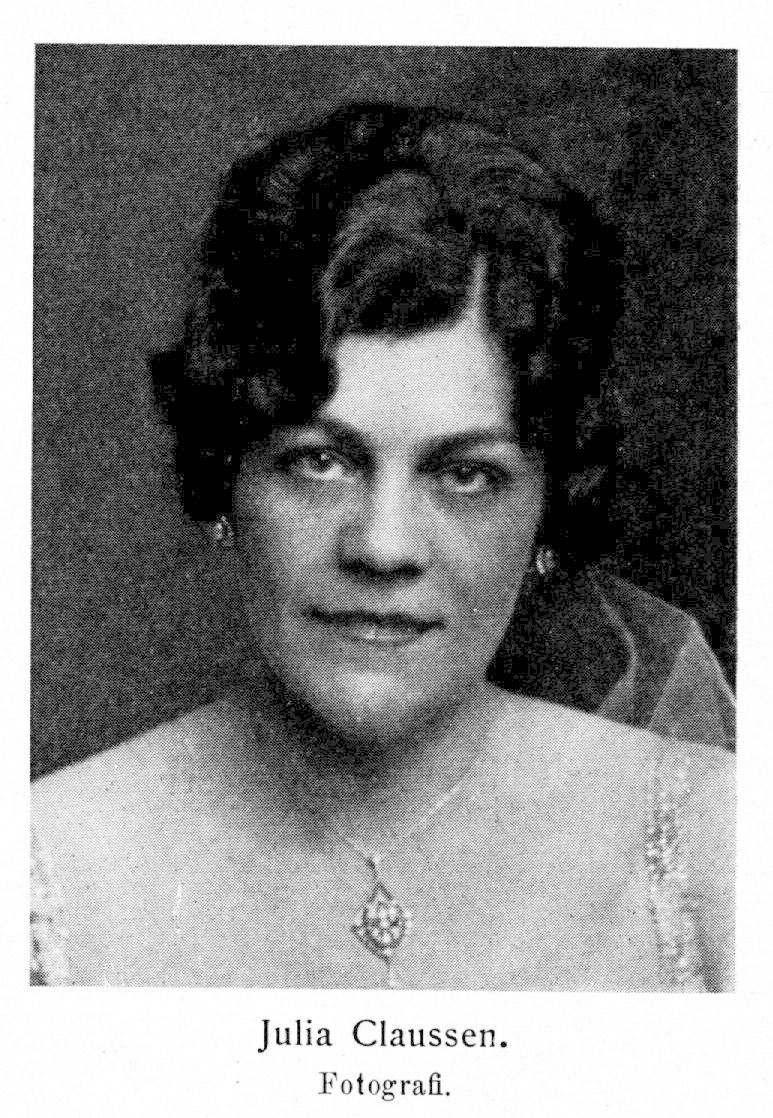 Claussen, Julia, f. Ohlsson, f. 11 juni 1879 i Stockholm. Föräldrar: bokbindaren Karl Gustav Ohlsson och Rosalie Elisabet Lindholm. Åtnjöt undervisning i folkskola; elev vid Stockholmsavdelningen av rikstelefon 10 juni 1897; lokaltelefonist vid rikstelefon i Stockholm 1 aug. 1897—31 juli 1898; elev i sång vid musikkonservatoriet ht. 1898—vt. 1902; tillika elev vid den med konservatoriet förenade teaterskolan (från ht. 1899 operaskolan vid konservatoriet) vt. 1899—vt. 1902; förklarad mogen för debut nov. 1902; debuterade jan. 1903 å K. teatern; engagerad därstädes 1903 -12; idkade sångstudier i Berlin för professor Friedrich somrarna 1903—05; engagerad vid Chicago Grand Opera Co, Chicago, 1913 —17 och vid Metropolitan Opera Co, New York, från 1917 samt tilllika vid Royal Opera, Covent Garden, London, 1914, Théâtre des Champs-Elysées, Paris, 1914 och Mexico Opera Centennial, Mexico City, 1921; har givit ett stort antal gästspel och konserter i Europa, bl. a. i Stockholm nästan årligen från 1919, och i Amerika; förvärvade medborgarrätt i Nordamerikas förenta stater 1920. LMA 1912; svensk hovsångerska 1923; innehar hederstecknen Litteris et artibus, Ludvig Normanmedaljen, Jenny Lindmedaljen och Kristina Nilssonmedaljen; hedersledamot av Sigma Alfa Iota; v. president av National Opera Club of America; innehar även andra utländska ledamotskap och hederstecken.