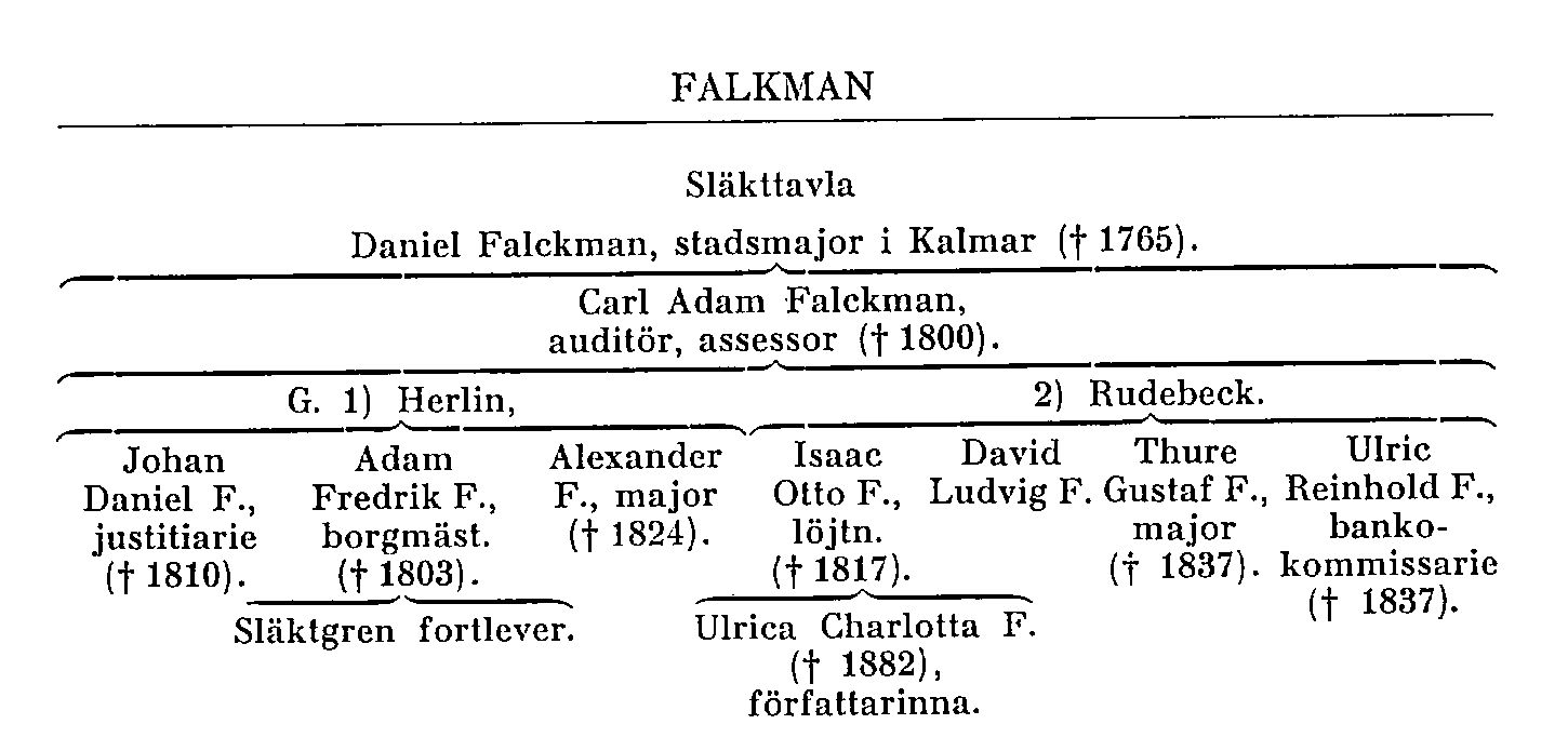Stadsmajoren D. Falkman (d. 1765) äktade 1) 1714 Anna Elisabeth Björnberg (f. 1693, d. 1731), dotter av majoren vid Kalmar reg. Anders Björnberg d. ä. (Rudelius, s. 217 f.), och 2) Maria von Wagner från Danmark, som efter kort tid övergav honom 1749 (hon dog 1763 i Stockholm; detta äktenskap var barnlöst). Med första hustrun hade stadsmajoren bl. a. en son, auditören vid Hessensteinska reg., tituläre assessorn Carl Adam Falckman (f. 1717, d. 1800). Denne, som bodde på Johannisnäs i Dunkers sn (Söd.), var g. 1) 1749 m. Margareta Charlotta Herlin och 2) 1760 m. Eleonora Rudebeck (d. 1800) samt hade i första giftet fem, i andra tio barn. Söner i första giftet voro bl. a.: a) justitiarien i Krigshovrätten Johan Daniel Falckman (f. 1751, d. 1810 i Karlskrona; gift men barnlös), vars latinska skrift om Dunker och Lilla Malma 1769 utgavs i övers, av B. Blomkvist (1939; Sörmländska handl., nr 6); b) borgmästaren i Trosa, riksdagsmannen i borgarståndet 1792 Adam Fredrik F. (f. 1753, d. 1803), vars släktgren fortlever; c) kaptenen vid Karelska jägarekåren, slutl. majoren Alexander F. (f. 1758, d. 1824), vars gren är utdöd.