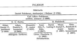 1. Den ena och mest kända släkten F., ursprungligen från Falkenberg, är emellertid på grund av senare, långvariga bosättningsförhållanden mest känd som Malmösläkten Falkman; se särskild artikel nedan s. 261.