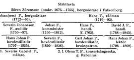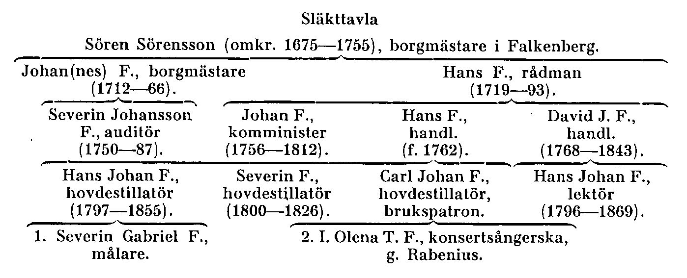 Handlanden Hans F. (f. 1762) hade i sitt gifte med Olena Falkengren tre söner. Den äldste, Hans Johan F. (f. 18 dec. 1797 i Falkenberg, d. 1855) var fabrikör i Stockholm, men flyttade 1843 till Helsingfors och blev hovdestillatör. En hans son var genre- och historiemålaren Severin Gabriel F. (F. 1), som verkade i Finland och Sverige. Av hovdestillatören H. J. F:s bröder blev en, Severin F. (f. 1800, d. 1826), hovdestillatör i Stockholm, medan den tredje, Carl Johan F., blev hovdestillatör i S:t Petersburg. Denne Carl F., som kallades brukspatron, var en tid en förmögen man, mest genom det brännvin och den vodka, som han sålde; hans destillationsapparater anges ha väckt Berzelii intresse. Carl F. blev emellertid sedan ruinerad. Han är som äldre skildrad av sin dotterson Olof Rabenius, som beskriver honom som »en lättantändlig man både i vrede och hänförelse». Som äldre bodde han åter i Sverige. Han var fader till konsertsångerskan Ida Olena Teresia F. (F. 2), som 1876 äktade juris professor O. M. T. Rabenius. Släkten fortlever.