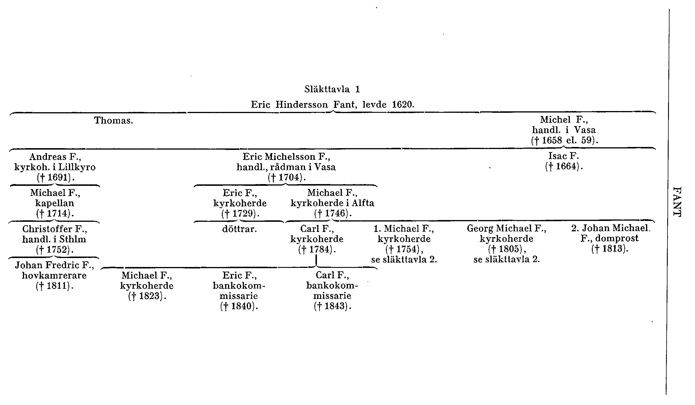 Fant, ursprungligen österbottnisk präst- och lärdomssläkt. Äldste säkert kände stamfadern är bonden Eric Hindersson Fant på Fant hemman i Staversby, Mustasaari sn (Södra Österbotten), 1594–1619, i Voitby 1620. Olika teorier finnas om hans härstamning. Möjligen kan Eric Hindersson ha fått namnet genom gifte med Mårten Andersson Fants änka i Staversby. Eric Hindersson hade sönerna Thomas, bonde i Voitby, och Michel Fant (f. omkr. 1588, d. 1658 eller 1659 i Vasa). Denne blev handlande i Vasa, där han bodde i varje fall från 1627. Åren 1655 och 1657 fraktade han på egna skutor krigsfolk till Stockholm. Han bedrev en mycket omfattande inrikes handel och ägde en betydande förmögenhet; en mängd rättegångar fördes efter hans död för indrivande av fordringar i olika orter. Han innehade jämte rådman Herman Jesenhaus beckbruk på Melmölandet utanför Vasa; hans arvingar avstodo bruket, som vållat stora tvister, till ett bolag av stadens äldre borgare 1693. I gifte med Anna Ericsdotter hade Michel F. bl. a. tre söner, varav den ene, Isac F., dog 1664 som student i Åbo. Av de övriga blev Andreas F. (d. 1691) kyrkoherde i Lillkyro (Södra Österbotten). Dennes son kapellanen i Vasa, senare i Kvevlaks Michael F., dog i Kemi 1714 på flykt undan ryssarna. M. F:s. son Christoffer F. (f. 1702, d. 1752) blev grosshandlare i Stockholm (burskap 4 dec. 1739); hans gren utdog på manssidan med sonen, hovkamreraren Johan Fredric F. (f. postum 1752, d. 1811).