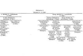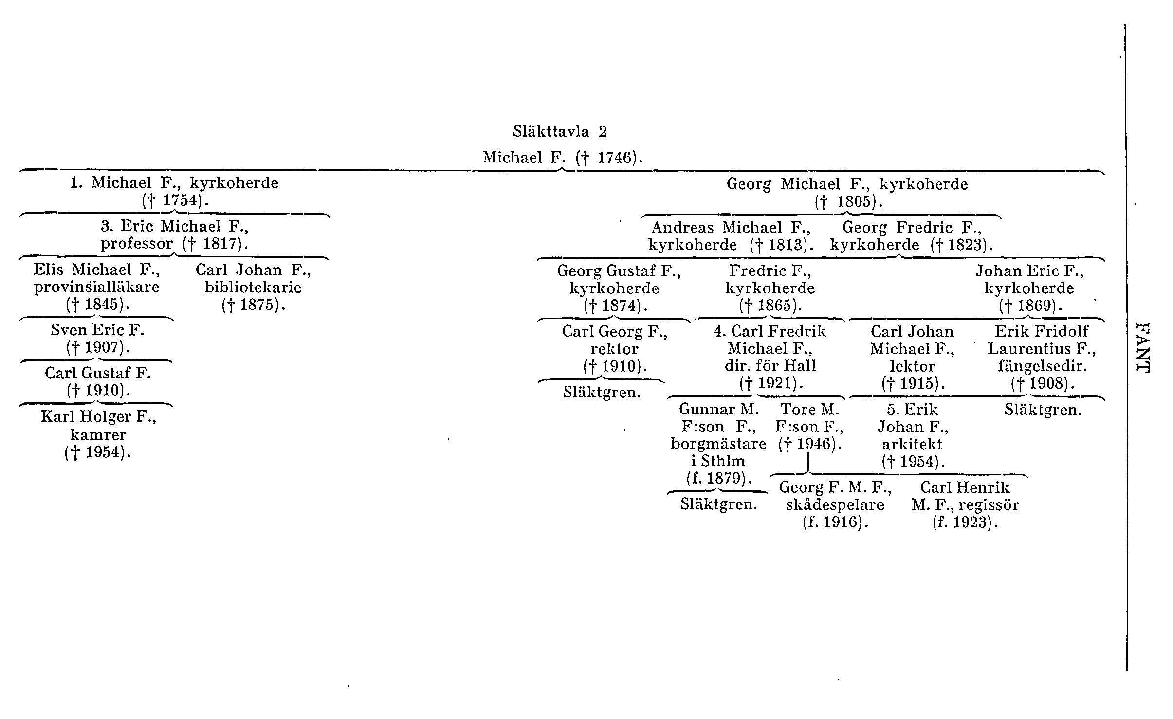 Av den nu levande släkten härstammar äldre linjen från historikern professor E. M. F:s (se ovan; F. 3) son provinsialläkaren (på Gotland 1817; i Lidköping 1830) och tituläre assessorn Elis Michael F. (f. 1787, d. 1845), som hade förtjänster om barnmorskereglementet. En sonsons son till denne var kamrer Karl Holger F. (f. 1888, d. 1954) i Stockholm. Holger F. gjorde samlingar om sin släkt och var medförfattare (jämte K. Hedman) till den i Genealogiska samfundets i Finland årsskrift, 10, 1926 (tr. 1927), publicerade genealogien över släkten. Efter kamrer H. F: s död tillhöra hans nämnda anteckningar Genealogiska föreningen och förvaras bland dess samlingar i Riksarkivet. En yngre bror till läkaren Elis M. F. var Carl Johan F. (f. 1798, d. 1875; ogift), som blev magister i Uppsala 1821 och docent i politik 1823. Han ingick 1822 vid Uppsala universitetsbibliotek, där han blev ordinarie amanuens 1830, titulär vice bibliotekarie 1833 och ordinarie 1847 samt 1858, vid 60 års ålder, bibliotekarie och chef. Han hade visat sig ha goda idéer i det praktiska biblioteksarbetet och vaket intresse för bibliotekets krav, men hade genom sin timida och fridsamma natur svårt att göra sig gällande (Annerstedt, 1921; Walde). Vid sin utnämning till chef var han redan till åren kommen och kunde därför ej göra några större insatser för biblioteket. Han fortsatte emellertid arbetet på bytesförbindelsernas utvidgande, och biblioteket inträdde 1859 i den av överbibliotekarien professor C. J. Caesar i Marburg ledda Akademischer Tauschverein, varigenom det kom i förbindelse med över 30 utländska universitet. Om hans befattning med de gustavianska papperen se D. Almqvist (i Personhist. tidskr. 1941–42). Under C. J. F:s tid förvärvades 1860 Göran Wahlenbergs och greve C. G. Oxenstiernas boksamlingar. På en yngre generation verkade »Calle F.» som »en liten, förtorkad gubbe» (Hamilton). Hans papper finnas i Uppsala univ.-bibliotek, liksom brev från honom, bl. a. till J. H. Schröder (22 st., 1830–57, sign. G 263 c).