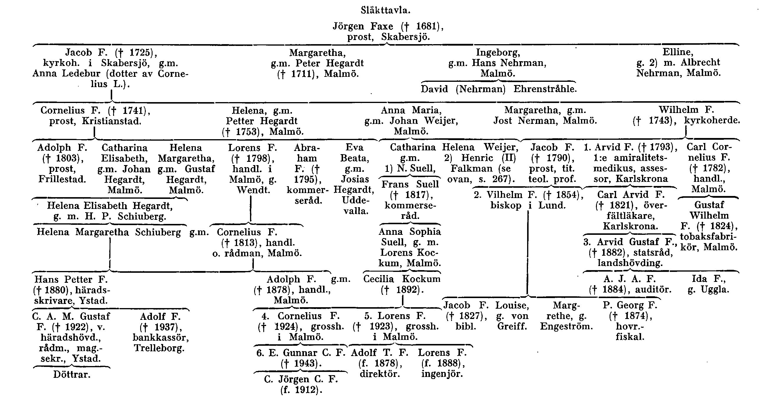 Den förut nämnde prosten i Kristianstad Cornelius F. (d. 1741; ovan s. 392) blev stamfar för släktens äldre linje. Han karakteriseras som »en gammaldags präst i sin prydno»; han åtnjöt biskop Andreas Rydelius' förtroende och bemötte med saktmod och vidhjärtenhet den radikala pietismens anhängare i sin församling (Pleijel, s. 92). C. F. hade i gifte med Beata Elisabeth Lönn flera barn, av vilka en son behöll den ecklesiastika traditionen, nämligen kyrkoherden i Frillestad (Malm.), prosten Adolph F. (f. 1721, d. 1803; barnlös), medan en annan son, Abraham F. (f. 1731, d. 1795; ogift), ingick i Kommerskollegium 1754 och blev kommerseråd 1792. Inte mindre än tre av deras systrar blevo ingifta i släkten Hegardt (en i Uddevalla, två i Malmö). Den äldsta dottern Catharina Elisabeth F. (f. 1722, d. 1776), g. 1752 m. faktorn och handlanden Johan Hegardt, fortsatte efter hans död 1753 den av honom ägda yllefabriken i Malmö. Hon drev denna under växande svårigheter till 1772, då den nedlades (Kjellberg, s. 682 ff.). Prosten C. F:s (d. 1741) andra dotter Helena Margaretha F. (f. 1728, d. 1758) hade med handlanden Gustaf Hegardt (d. 1783) dottern Helena Elisabeth Hegardt, g.m. handlanden Hans Petter Schiuberg (d. 1793) i Malmö. Deras dotter Helena Margaretha Schiuberg (f. 1778, d. 1811) gifte sig med Cornelius F. (d. 1813), och från hennes familj ärvdes 'Faxeska huset' i Malmö, varom se nedan (s. 395).