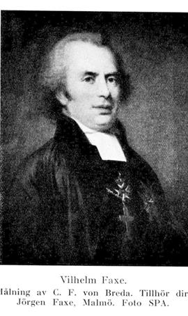 2. Vilhelm Faxe, f. 18 maj 1767 i Kvistofta sn (Malm.), d. 22 sept. 1854 i Lund. Föräldrar: häradsprosten och tit. teologie professorn Jacob (Wilhelmsson) Faxe och Petronella Hjort. Student vid Lunds univ. 12 dec. 1782; examen theologicum där 29 nov. 1783; disp. pro exercitio 25 febr. 1786; disp. pro gradu 9 maj 1787; fil. magister 23 juni s. å.; docent i romersk vältalighet vid Lunds univ. 19 juni 1788; disp. 1791 för teol. kand. ex.; docent i teologi 9 aug. 1791; vice notarie vid Lunds domkapitel 2 juni 1790; ord. konsistorienotarie 24 jan. 1791–1 maj 1805; prästvigd i Lund 5 jan. 1793; adjunkt i österländska och grekiska språken vid Lunds univ. 18 jan. 1800; tillika kyrkoherde i Södervidinge och Annelövs pastorat 30 maj 1804 (tilltr. 1 maj 1805); prost över egna församlingar och vice häradsprost i Harjagers härad 23 okt. 1805; erhöll 1806 uppdrag att sammanställa författningar hörande till kyrkolagen; e.o. teologie professor med föreläsningsskyldighet i homiletik och kyrkolagfarenhet 15 febr. 1808; professor i pastoralteologi vid Lunds univ. 21 mars 1809; teol. doktor i Uppsala 7 okt. s. å.; biskop i Lunds stift och prokansler för Lunds universitet 12 aug. 1811; fil. jubelmagister i Lund 23 juni 1838. – Bevistade som riksdagsman i prästeståndet riksdagen i Örebro 1810 (led. av nämnden för tronföljarvalet) och riksdagarna 1812–34. – LNO 1811; LFS 1815 (ordf. 1822–23, 1824–25, 1826–34); KNO 1815, uppflyttad till KmstkNO 1844; LSkS 1816; LLA s. å.; LVVS 1818; HedLHA 1829; RCXIIIO 1838.