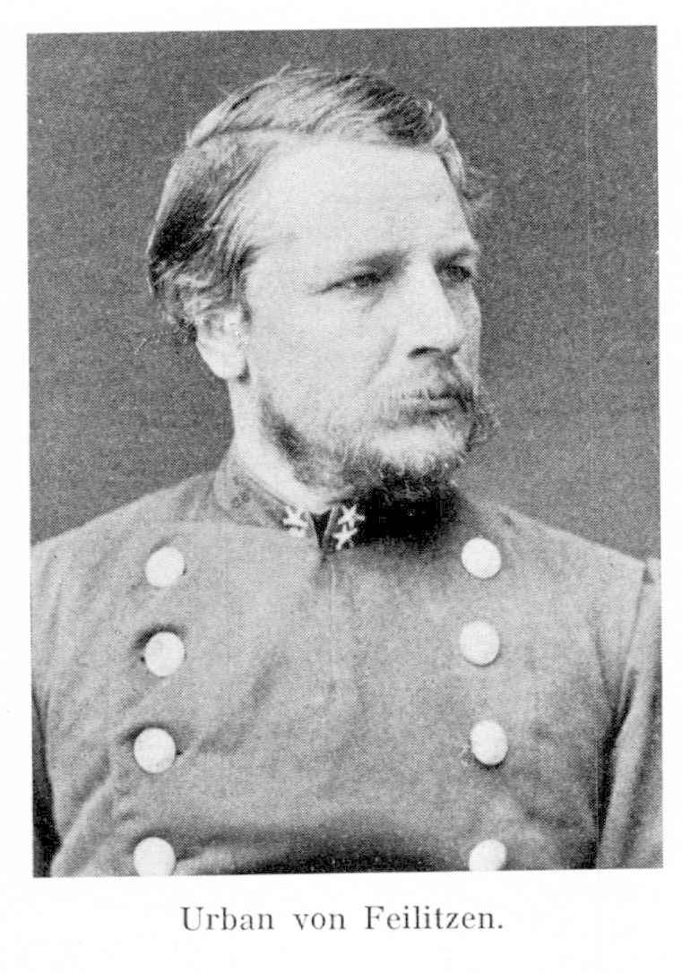 3. Olof Otto Urban von Feilitzen, f. 23 maj 1834 på Vargsäter, Skeda sn (Ög.), d. 14 sept. 1913 på Lövingsborg där. Föräldrar: löjtnanten och godsägaren Gottfrid Wilhelm Matthias von Feilitzen och Elisabeth Sophia Stålhammar. Kadett vid Karlberg 1 nov. 1847; underlöjtnant vid Svea artillerireg. 26 april 1853, vid Andra livgrenadjärreg. 16 maj 1856; andre löjtnant där 27 juli 1864; förste löjtnant 3 aug. 1869; kapten 2. kl. där 22 sept. 1876 och 1. kl. 4 april 1879; avsked 24 juli 1885. – Ägde och brukade Lövingsborg i Skeda sn. Författare under pseud. Robinson, skriftställare, kritiker. – RSO 1880.