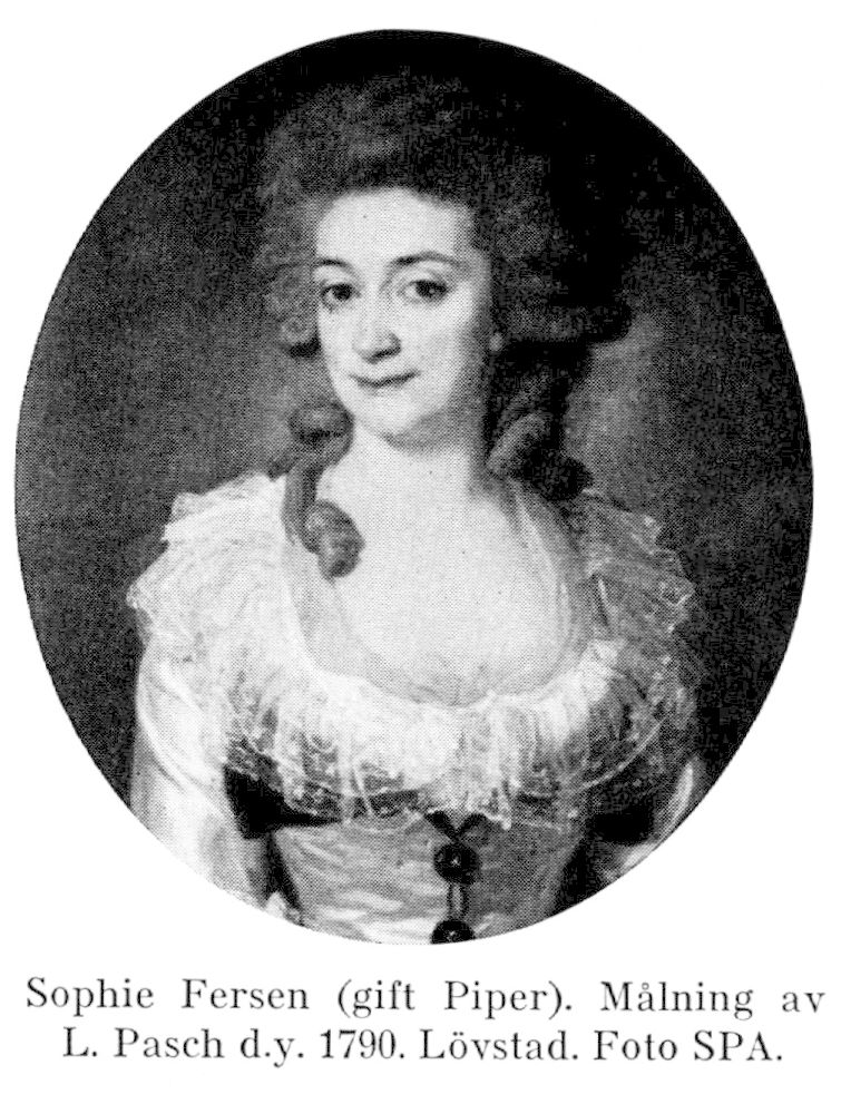 Sophie Fersen, riksrådet Axels yngre dotter, var redan som ung en mycket uppmärksammad, charmerande och vacker dam i stockholmssocieteten. Hertig Fredrik Adolf, som tidigare svärmat för hennes kusin Ulla F. (jfr ovan s. 684 f.), förälskade sig sedan djupt i Sophie och framställde, då hon var sjutton år, i jan. 1774 ett formligt friaranbud. Hennes far avvisade förslaget såsom olämpligt, då hon ej var kunglig, och antydde för hertig Fredrik, att man redan hade en lämplig pretendent på Sophies hand, kammarherren greve Adolph Piper. Denne var en förmögen man och således ett solidare parti än den i affärer alltid strandsatte hertigen. En invit från hovet, att Sophie skulle bli statsfru hos änkedrottningen, ansåg fadern vara ett maskerat försök att göra henne till hertigens mätress och avslog »nådebeviset». Affären varade i två år, varvid hertigen till Sophie framställde ett direkt förslag att enlevera henne till Tullgarn: en präst skulle där viga dem. Sophie gick dock ej med därpå. Hennes förtrogna var hertiginnan Charlotte, prins Karls (Karl XIII) gemål och sedermera drottning. Hertiginnan (Dagb., 1, s. 44 f., 446 ff.) har nedskrivit en relation, som anger, att Sophie F. var uppriktigt förtjust i hertig Fredrik, men att hon till slut resignerade och efter faderns önskan, men utan någon kärlek, gav Piper sin hand 1777. Äktenskapet blev föga lyckligt. I varje fall på 1790-talet hade hon till älskare den bekante hovmannen och politikern, överstekammarjunkaren, generallöjtnanten friherre Evert Wilhelm Taube (f. 1737), brodern Axels nära vän (jfr F. 8). Hennes förbindelse med Evert Taube, som var allmänt känd, var såsom Lydia Wahlström (s. 34) uttryckt det »efter dåtidens sätt att se nära nog att betrakta som ett äktenskap». Piper dog 1795. Axel F. d.y. anger i sin dagbok 30 jan. 1799, att Sophie tänkte på att gifta sig med Taube. Denne blev emellertid s.å. mycket sjuk. Sophie vistades med honom och Axel F. i Karlsbad 1799, där Taube dog 15 augusti till Sophies och Axels stora sorg (jfr Axel d.y: s dagb., 3, s. 409, 412 f.). Taubes testamente till Axel F. (se ovan s. 726) ansågs vara en maskerad form för, att Sophie skulle ärva Taube (hertiginnans dagb., 6, s. 315); många av Taubes saker finnas på Lövstad. Cirkulerande rykten, att antingen L. v. Engeström eller också Sophie själv skulle ha förgiftat Taube äro icke blott obestyrkta utan orimliga (jfr Engeström, 2, s. 44 ff., 155 f.; Axels dagb., 3, s. 412, 415).