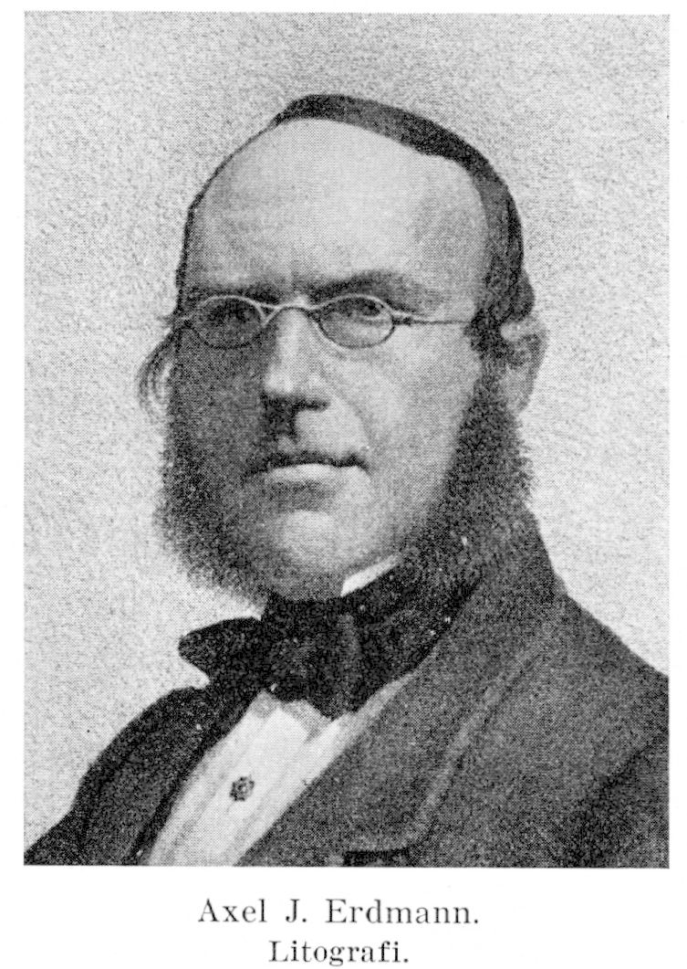 1. Axel Joachim Erdmann, f. 12 aug. 1814 i Stockholm (Tyska), d. 1 dec. 1869 där (Nik.). Föräldrar: grosshandlaren Joachim Friedrich Ehregott Erdmann och Anna Fredrika Flygarson. Elev vid privatskola i Stockholm; student vid Uppsala univ. 21 nov. 1829; hovrättsex. där 30 maj 1833; bergsex. 9 juni 1836; auskultant i Bergskollegium 4 juli s. å.; ord. elev vid bergsskolan i Falun 1837–38; arbete på Berzelius' laboratorium vintern 1839–40; deltog i av Brukssocieteten föranstaltade geologiska undersökningar inom Sverige 1841–48; förordnades att ha tillsyn över Bergskollegii bibliotek och mineralkabinett 6 juli 1846; förordnades som 3:e lärare vid bergsskolan i Falun 28 nov. 1850–2 febr. 1859, som lärare i kemi vid Högre artilleriläroverket å Marieberg 31 dec. 1852–16 dec. 1858; professors namn 27 april 1854; chef för de geologiska undersökningarna inom landet (Sveriges geologiska undersökning) 23 febr. 1858. LVA 1846 (preses 8 april 1868 för ett år); RNO 1853; LVS 1856; LLA s. å.; LFS 1865; HedLLA 1869; KNO s. å. Erhöll Jernkontorets stora guldmedalj 1859; innehade även utländsk orden.