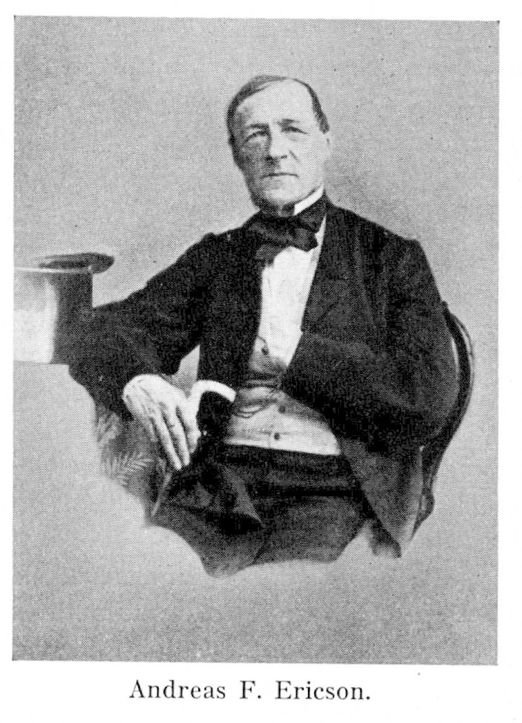 1. Andreas Fredric Ericson, f. 9 juli 1795 i Kristianstad, d. 28 juli 1864 i Vimmerby. Föräldrar: handlanden Carl Friedrich Ericson och Anna Sophia Rasch. Privatundervisning i Kristianstad; studier i Lund; anställd på handelskontor i Köpenhamn 1810; biträde hos modern i Kristianstad till 1819; burskap som handlande i Kristianstad 20 dec. 1819; idkade minuthandel där till början av 1830-talet, sedan grosshandel; led. av och 1844 vice ordf. i drätselkommissionen i Kristianstad; led. av direktionen för Kristianstads läns sparbank 1826; led. av hallrätten, kyrkorådet, skoldirektionen, direktionen över J. H. Dahls flickskola samt ordf. i sjömanshusdirektionen, allt i Kristianstad; riksdagsman i borgarståndet för Kristianstad 1844–45, 1847–48, 1856–58 och 1859–60, tillika för Halmstad 1844–45 och 1847–48 samt för Laholm 1859–60 (led. av bankoutskottet, förstärkta stats-, lag- och konstitutionsutskotten 1844–45, av statsutskottet samt förstärkta konstitutionsutskottet 1847–48, av statsutskottet samt förstärkta bevillnings- och lagutskotten och suppleant i bankoutskottet 1856–58 samt led. av bevillningsutskottet och förstärkta bankoutskottet 1859–60); flyttade 1862 till Göteborg.