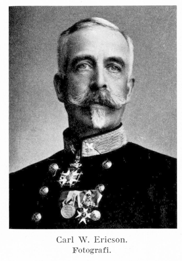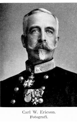 5. Carl Wilhelm Ericson, bror till E. 3 och E. 4, f. 28 sept. 1840 på mekanikerbostället Åker, Gärdhems sn (Älvsb.), d. 10 okt. 1928 i Ängelholm. Student vid Uppsala univ. 29 maj 1857; furir vid Västgöta reg. s. d.; fanjunkare där 29 jan. 1858; officersex. 26 april s. å.; underlöjtnant vid reg. 26 okt. s. å.; underlöjtnant i fransk krigstjänst sept. 1862–april 1864; löjtnant i Västgöta reg. 7 aug. 1863, vid reg. 5 juli 1864; ordonnansofficer hos konungen 8 juli s. å.–1872; anställd i italienska armén juni–sept. 1866; kapten 1 maj 1874; major och bataljonschef vid Gotlands nationalbeväring 13 juni 1879; överstelöjtnant och 1. major vid Västgöta reg. 27 april 1881; tf. chef för reg. 30 dec. 1885; överste i armén 15 maj 1886; överste och chef för Västgöta reg. 25 nov. 1887; bevistade tredje franska arméns fälttjänstövningar sept. 1888; generalmajor i armén 19 maj 1893; åtföljde kronprinsen till kejsarkröningen i Moskva maj 1896; chef för tredje arméfördelningen 4 sept. s å.; avsked med tillstånd att kvarstå som generalmajor i generalitetets reserv 13 juni 1902; generallöjtnant i generalitetets reserv 12 aug. s. å., i generalitetet 23 aug. s. å.; inspektör för trängen 22 maj 1903–23 febr. 1906 (avgång ur krigstjänsten); styrelseled. och kassadirektör vid Skånes enskilda banks kontor i Stockholm 1902–10; styrelseled. i Skandinaviska kredit a.-b. och kassadirektör vid dess avdelningskontor i Stockholm 1910–17. – Led. av Älvsborgs läns landsting 1872–76, av Skaraborgs läns landsting 1888–1896; led. av riksdagens andra kammare 1876–78, 1892 urtima–93 och 1900–02 (led. i tillfälligt utskott 1876, i bankoutskottet 1877, i bevillningsutskottet 1878); led. av kommittén för ordnande av vägunderhållsbesväret på landet 24 nov. 1876–14 dec. 1880; suppleant för fullmäktige i Riksgäldskontoret 4 mars 1878–5 mars 1888; led. av lantförsvarskommittén 8 juni 1881–19 juni 1882; stadsfullmäktig i Skövde 1884–85, ånyo 1888 (ordf. 1889–95); led. i kommittén för granskning av de särskilda truppernas exercisreglemente 3 nov. 1885–1887; led. av arméns fullmäktige 1893; led. av kommittén för granskning av förslaget till ny härordning 1–31 okt. 1900, för revision av strafflagen för krigsmakten 1 april–29 sept. 1901. – Friherre vid äldre broderns död 8 mars 1900; bebodde och brukade samt ägde till största delen Rånnum i Västra Tunhems sn (Älvsb.) 1871–79. – GMtf 1864; RDDO 1865; RNS:tOO 1868; RSO 1880; LKrVA 1881; KSO2kl 1891; KSO1kl 1893; KmstkSO 1897; StkDDO 1909; innehade även ett flertal andra utländska ordnar.