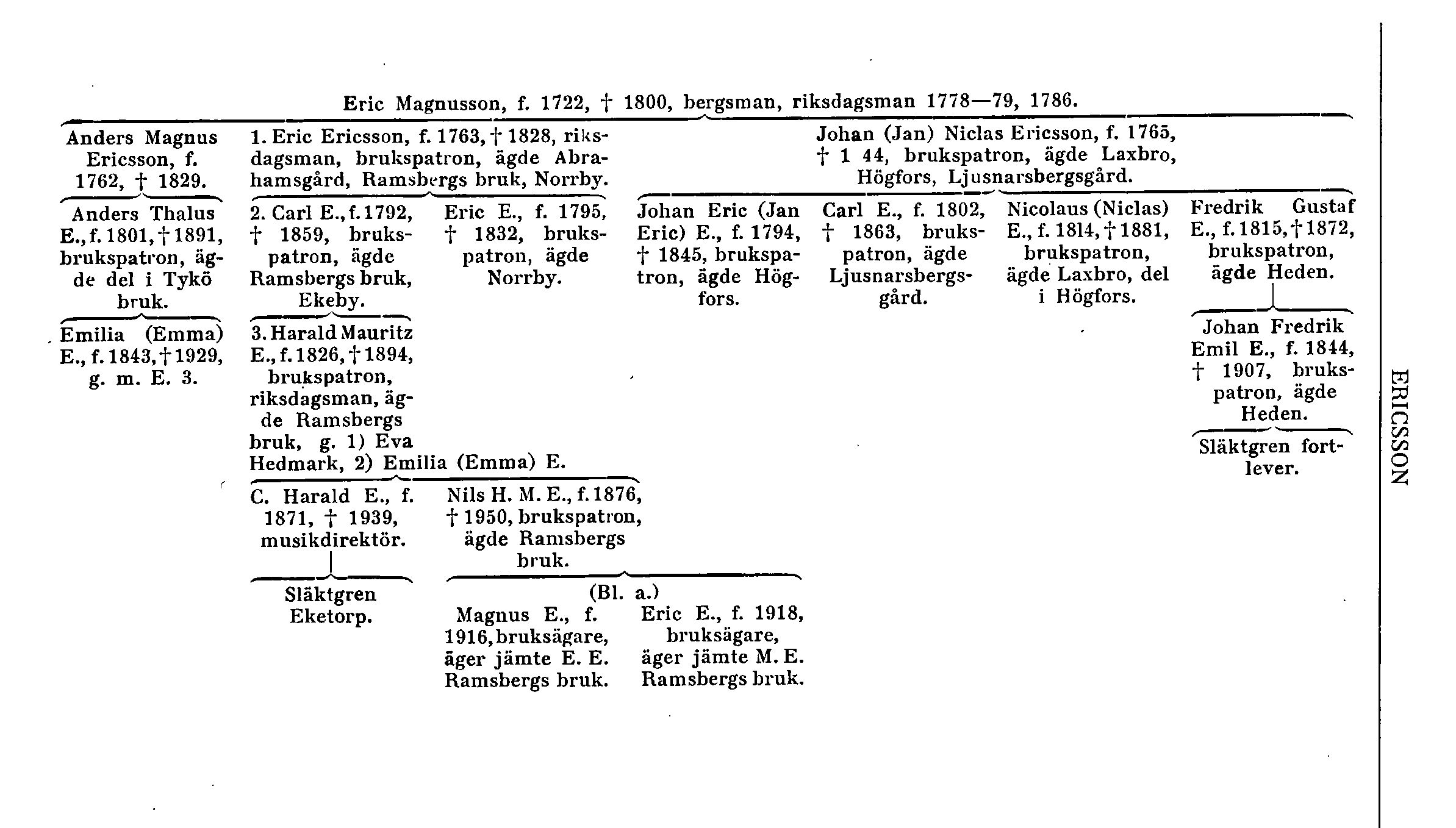 Från Eric Magnusson på Laxbro stamma tre släktgrenar, vilka samtliga bära det släktnamn, Ericsson, som hans söner förvandlade från patronymikon till fixerat namn. Den äldste av sönerna smidesfabrikören i Eskilstuna Anders Magnus Ericsson (f. 1762, d. 1829), som sina sista år tjänstgjorde vid Krokfors' gjuteri, vilket då kom till stånd i Ljusnarsberg, hade mindre lycka i sina affärer och gjorde konkurs. Dennes son, brukspatron Anders Thalus E. (f. 1801, d. 1891), började sin bana som ritare hos Samuel Owen. Av Owens svåger, den skotske mekanikern David Cowie, förmåddes Thalus E. att i maj 1836 överflytta till Finland. Där bildade s. å. bergsrådet J. J. Julin (sedan adl. von Julin) på Fiskars bruk, Cowie och Thalus E. ett bolag för att etablera Fiskars mekaniska verkstad. Cowie och Th. E. blevo emellertid missnöjda med Julin och grundlade en egen mekanisk verkstad, Ericsson & Cowie, i Åbo och övergingo vid kontraktstidens utgång 1844 helt till denna. Thalus E. äktade i Finland Emilia (Emma) Catharina Feilcke från Ekenäs. Han kallades brukspatron såsom även delägare i Tykö bruk i Finland från 1863 och blev en mycket förmögen man. Återflyttad till Sverige 1871 levde han sina sista 20 år i Stockholm men var då mycket sjuklig. Han hade två döttrar, av vilka den yngre var gift med översten Wilhelm Ridderstad, känd bl. a. som militärhistorisk författare och samlare, medan den äldre Emilia (Emma) E. äktade sin syssling brukspatron Harald M. E. (E. 3). A. Th. E:s släktgren är utdöd.