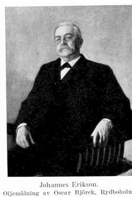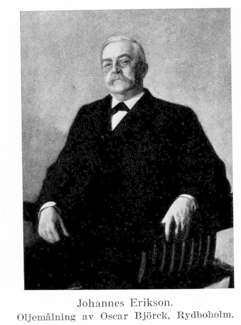 2. Johannes Erikson, den föregåendes son, f. 22 april 1839 i Kinna sn (Älvsb.), d. 11 jan. 1912 genom olyckshändelse. Skolstudier 1848—56 i en privat elementarskola i Göteborg; elev vid Göteborgs handelsinst. 9 jan. 1856–16 juni 1857; utbildningen kompletterad genom studieresor till England och kontinenten; tjänsteman vid Rydboholms Väfverifabrik 1857; disponent vid Rydboholms bolag 1873–84 och vid Rydboholms a.-b. 1885–1912; verkställande direktör i Varberg–Borås järnvägs a.-b. 1877–1907 samt ordf. i bolagets styr. 1903–07 och 1910–11; led. av centralstyr. för Borås enskilda bank 1879–1912; ordf. i styr. för Skandinaviska gummi a.-b. i Viskafors 1890–1912; verkställande direktör i Rydahls manufaktur a.-b. 1892–1912; ordf. i styr. för Kinnaströms väfveri a.-b. 1895–1912 och i Kungsfors' spinneri a.-b. 1898–1912. Landstingsman 1881—96; led. av riksdagens första kammare 1883–85 samt av dess andra kammare 1892–93; led. av Älvsborgs läns södra hushållningssällskaps förvaltningsutskott 1890–1912 samt dess ordf. 1895–1912; en av stiftarna av »De sju häradernas kulturhistoriska förening» i Borås 1903; ordf. i föreningens styr. 1903–12. RVO 1880; KVO2kl 1897; KVO1kl 1904.
