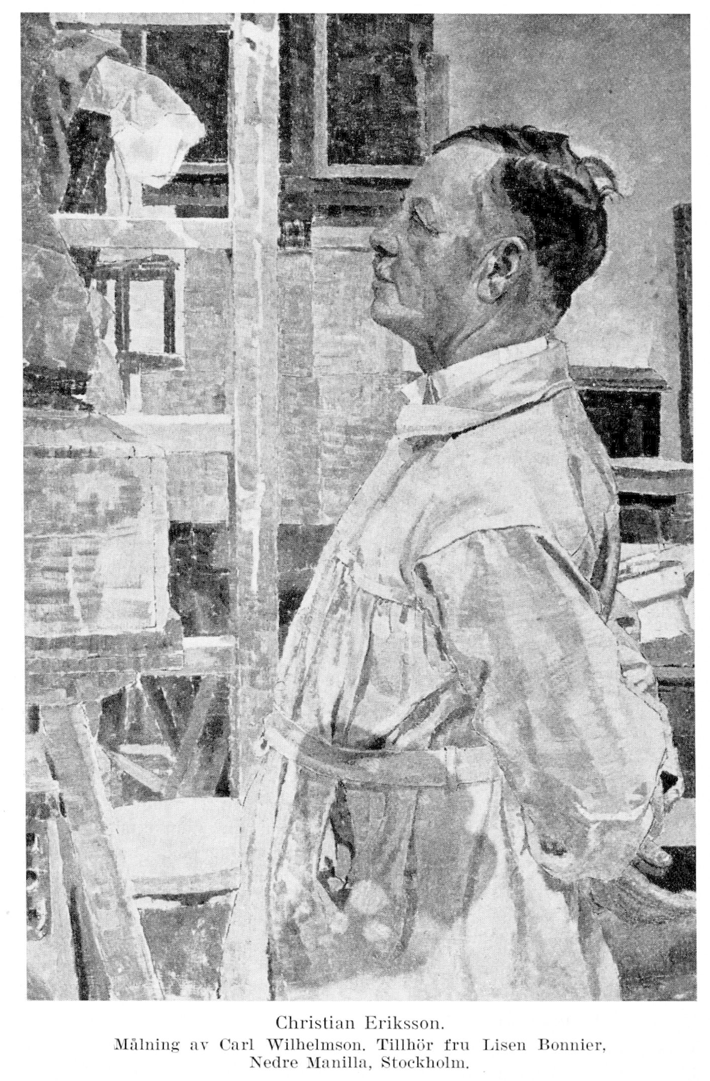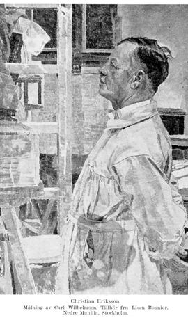 Christian Eriksson, f. 30 juni 1858 i Haget, Arvika sn (Värml.), d. 6 nov. 1935 i Stockholm (Maria). Föräldrar: hemmansägaren och bysnickaren Erik Olsson och Stina Olsdotter. Yrkesutbildning i faderns snickarverkstad; elev vid ornamentbildhuggare Jörlings verkstad i Stockholm 1875–77, var samtidigt elev på Tekniska skolans afton- och söndagskurser; elev vid Allgemeine Gewerbeschule i Hamburg 1877–81, arbetade samtidigt ett år i Heymans möbelfabrik där, därefter ett år hos ornamentbildhuggaren Ziegler och två år hos arkitekten Bichweiler i dennes »Kunstgewerbliche Werkstatt»; ansökte och fick stipendium från Tekniska skolan i Stockholm 1880; uttog avflyttningsbevis från Arvika landsförs. till Hamburg 3 nov. 1881; erhöll anställning där hos statybildhuggaren Carl Börner till 1883; inskrevs som elev vid École nationale des arts décoratifs i Paris 27 sept. 1883, avgångsbetyg 7 jan. 1885; elev vid École nationale et spéciale des beaux-arts 4 aug. 1884—14 april 1887 (erhöll då 3:e medaljen för figur modellerad efter antiken); arbetade även på sin lärare bildhuggaren A. Falguières ateljé samt på konstindustriella verkstäder och en keramisk fabrik samt som biträde åt andra skulptörer, bl. a. Per Hasselberg; erhöll 3:e medaljen för figurskulpturen »Martyren» på salongen i Paris 1888; tilldelades av Akademien för de fria konsterna 28 april 1888, Jenny Linds resestipendium på 3 000 kr. för ett år, förnyat för ännu ett år samt erhöll för ytterligare ett år ett resestipendium på samma belopp 29 maj 1890; studieresor till Italien 1890, 1891 och 1892; bosatt i Paris till 1897, då han återflyttade till Sverige; vistades i Paris våren 1900–hösten 1901; resor till Spanien 1920 och till Frankrike 1928. Bildhuggare. – Medlem av Konstnärsförbundets styrelse 1900, av styrelsen för Liljevalchs konsthall 1915–35 och av Stiftelsen Thielska galleriet 1925–35. – Hedersledamot av Värmlands nation i Uppsala 1904 och av Värmlands fornminnes- och museiförening 1933. KVO2kl 1926; OffFrHL 1930.