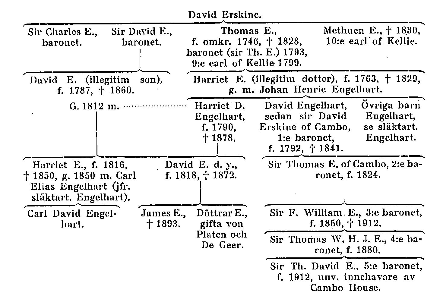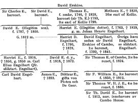 Efter den yngre pretendenten Karl Edvards nederlag vid Culloden 1746 gingo godsindragningar ut över hans anhängare, däribland medlemmar av ätten E. Sålunda indrogs av den jord, som medföljde värdigheten som earl of Kellie, allt utom slottsruinen med några få acres betesmarker (jfr nedan). Bland dem, som efter Cullodenkatastrofen och godsindragningarna emigrerade från Skottland, var Thomas E. (d. 1828), som 1759 tog affärsplats i Göteborg och arbetade sig fram till ställningen som en av stadens förnämligare grosshandlare samt brittisk konsul; om honom se särskild art. nedan. Hans äldre bror kapten David E. (d. 1793) och hans yngre bror Methuen E. (d. 1830) voro vid 1770-talets mitt bosatta som affärsmän i Bengalen i Indien (jfr nedan s. 482), varifrån dock Methuen E., i varje fall för en tid, återvände till sitt hemland 1779. Efter äldste brodern sir Charles E. (se släkttavlan) gick värdigheten som baronet till David, nu sir David E., och vid hans död 1793 till Thomas, som sådan sir Thomas Erskine. Denne återvände 1799 från Sverige till Skottland, s. å. han genom arv från en äldre linje fått värdigheten som 9:e earl of Kellie, dock utan det gods, som tidigare åtföljt titeln (jfr ovan). I stället hade han redan omkring 1790 inköpt ett annat, gammalt familjegods, Cambo House i Fifeshire, Skottland, vilket blev hans hem. Hans äktenskap med Anne Gordon var barnlöst. Lord Kellie hade emellertid före sitt äktenskap en illegitim dotter, Harriet E. (f. 1763, d. 1829), som 1787 äktade Johan Henric Engelhart (se denne), senare medicine professor i Lund och prost i Fellingsbro. Av deras nio till mogen ålder komna barn uppfostrades, hos morfadern i Skottland dels tre döttrar (Anna, Harriet och Caroline Engelhart), dels äldste sonen, David Engelhart. Lord Kellie adopterade denne dotterson och gjorde honom till sin universalarvinge. Lordens titlar kunde däremot ej ärvas genom den illegitima, dottern, professorskan Engelhart, utan värdigheten som earl of Kellie gick först till Thomas E:s yngre bror, Methuen E. (t barnlös. 1830) och efter denne till en avlägsen, här ovan nämnd släktgren. Lord Kellie lyckades emellertid utverka ett engelskt k. brev av 27 aug. 1821, som förlänade en ny, till Cambo House knuten baronetvärdighet åt hans dotter- och adoptivson. Härigenom förvandlades, professorssonen David Engelhart från Lund till sir David Erskine of Cambo (f. 1792, d. 1841), baronet, i Skottland. I sitt gifte (1821) med en förmögen prästdotter från Wales, Jane Silence-Williams (d. 1880), hade denne bl. a. tre gifta söner: överstelöjtnanten sir Thomas E., andre baronet (f. 1824), brittiske konsuln, på Madeira David Holland E. samt Hugh Henry E. Det gamla magnifika Cambo House brann 1879; slottet återuppbyggdes men icke i sin gamla stil. Son till sistnämnde sir Thomas samt tredje: baronet var översten sir Ffolliott William E. (f. 1850, d. 1912). Dennes äldste son, överstelöjtnanten sir Thomas Wilfred Hargreaves John E. (f. 1880), fjärde baronet, var fader till den nuvarande innehavaren av Cambo House, femte baronet sir Thomas David E. (f. 1912); rörande övriga grenar av släkten Engelhart än denna skotska Erskine-gren, se släktart. Engelhart.