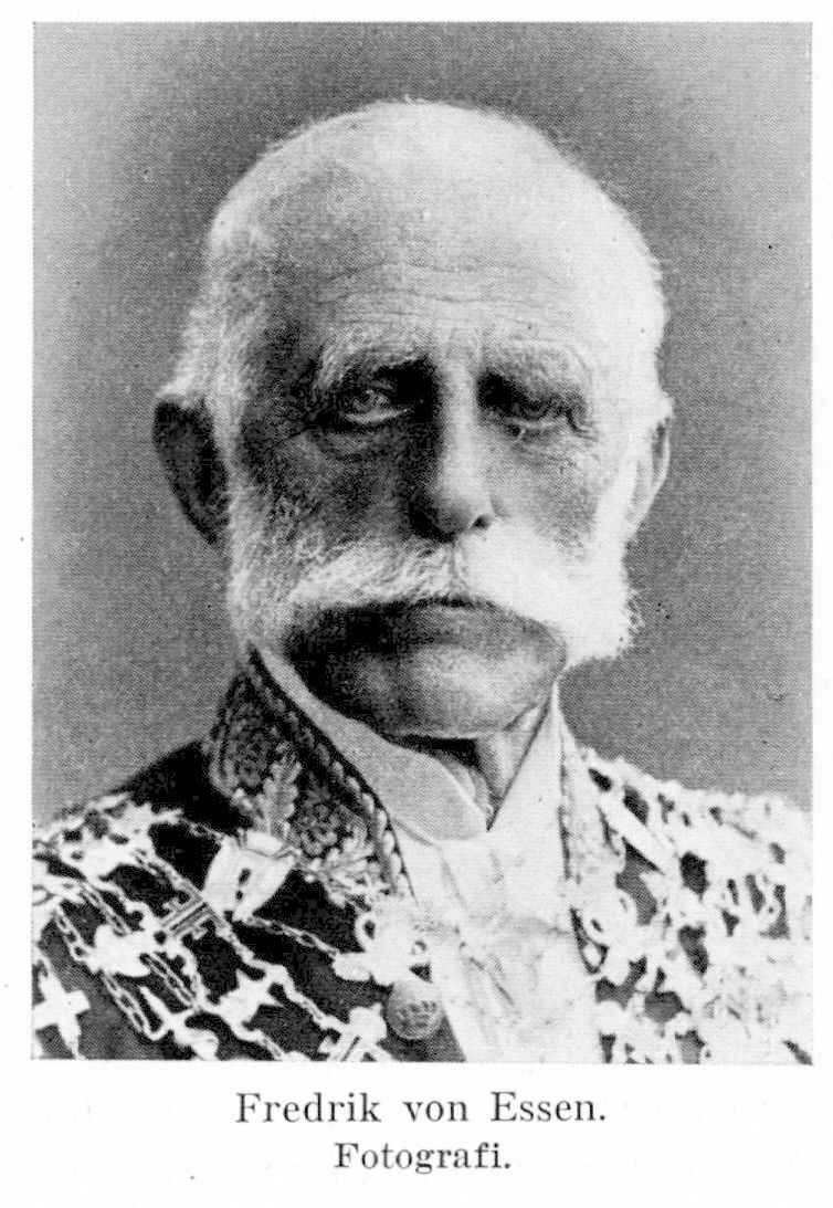 7. Fredrik von Essen, den föregåendes broder, f. 30 juli 1831 på Kavlås, d. 3 okt. 1921 i Stockholm (Osa). Kadett vid Karlberg 18 sept. 1845, utexaminerad 6 nov. 1850; underlöjtnant vid Livregementets husarkår 21 nov. 1850 med turberäkning från 6 nov.; fullgjorde gradpassering vid Livgardet till häst 12 nov. 1852–1 april 1853; underlöjtnant på stat vid Livregementets husarkår 9 juni 1855; löjtnant och förste adjutant 3 nov. 1857; ordonnansofficer hos kronprins Karl 16 jan. 1858, hos konung Karl XV 6 aug. 1859; andre löjtnant på stat 17 juli 1858; avsked med tillåtelse att kvarstå i kåren utan lön 15 juni 1861; avsked ur krigstjänsten 30 dec. 1863; ägare av Kavlås 1860; tjänstgörande kammarherre hos drottning Lovisa 16 mars 1863, tjänstfri vid hovet 1867; disponent vid Salsta, Vattholma och Länna egendomar (Upps. och Sth.; från 1873 Vattholma bruks a.-b.) 1863–1904; ägare av Salsta och Vattholma 1904; led. av Skaraborgs läns landsting under skilda perioder (första gången 1863), dess ordf. 1885–87; vice ordf. i Skaraborgs läns hushållningssällskap 1876–77 och 1879–91, hedersled. 1888; led. av ridderskapet och adeln 1862–63 och 1865–66; led. av riksdagens första kammare för Skaraborgs län 1867–74 och för Älvsborgs län 1877–1906 (suppl. i statsutskottet 1867–68, 1879–80, led. av statsutskottet 1869–70, 1872–74, 1877–78, 1880–83 och 1885–88, av bevillningsutskottet 1871; led. av särskilda utskottet urt. 1871); suppl. för fullmäktige i Jernkontoret 1886–89; bergslagsdeputerad 1886–87; led. av första kammarens protektionistiska partis förtroenderåd 1888; statsråd och chef för Finansdep. 6 febr. s. å.–6 (ej 2) nov. 1894; riksmarskalk 6 nov. 1894–12 dec. 1911 (avsked fr. o. m. 1 jan. 1912). – Led. av kommittén för stuteriväsendets ordnande 1868–69, av kommittén för veterinärväsendets ordnande 1874, av kommittén för undersökning rörande förvaltningen vid Ultuna lantbruksinstitut 1877, av kommittén för lantförsvarets ordnande 1880 (befriades s. å. från uppdraget), av kommittén angående stambanor genom övre Norrland 1885, av den s. k. ekonomiska kommittén 1886–87; ordf. i styrelsen för Hellefors bruks a.-b. 1892–1904; i Styrelsen över Allmänna brandförsäkringsverket för nybyggnader å landet 1895–1919, i kommittén angående omorganisation av den centrala ledningen av landets hästavel 1896–98, i skogskommittén 1896–99, vid adelsmötet 1896, i styrelsen för a.-b. Bofors 1897 –1916, i Svenska bibelsällskapets kommitté 1898–1915 (vice ordf. 1895–98), i Riddarhusdirektionen 1899—1908, i Styrelsen över Sveriges allmänna hypoteksbank 1900–07. – RDDO 1862; RNO 1872; LLA 1879; KVO1kl 1881; KNO1kl 1888; KNS:tOO1kl 1890; KmstkNO 1891; HedLLA s. å.; RoKavKMO 1895; RDEO 1897; OII:sJmt s. å.; KmstkVO 1905; vice kansler vid KMO 1905–07, kansler 1907–18; GVSbm 1906; OII:sGbmt 1907; GV:s Olympiska medalj 1912; HedLÖS s. å.; innehade även andra utländska ordnar.