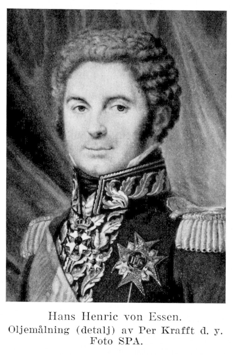 3. Hans Henric von Essen, son av E. 2, f. 26 sept. 1755 på Kavlas i Hömbs sn (Skarab.), d. 28 juli 1824 i Uddevalla. Student vid Uppsala univ. 3 okt. 1766; studerade där och i Göttingen till 1770; fanjunkare vid Mörnerska husarreg:tet 1 jan. 1768; sekundadjutant där 27 sept. s. å.; kornett vid Västgöta kavallerireg. 27 jan. 1773; stabslöjtnant där 20 dec. 1775; hovstallmästare 5 juni 1777; transport till Livdragonregrtet 19 aug. 1778; ryttmästare vid Smålands kavallerireg. 8 sept. s. å.; major vid Lätta dragonreg: tet 2 juni 1783; reste sommaren 1783 med Gustav III till Fredrikshamn för att möta kejsarinnan Katarina II och 1783–84 med konungen till Italien och Frankrike; överste i armén 14 dec. 1787; överstelöjtnant vid Lätta dragonreg:tet 17 dec. s. å.; förste hovstallmästare 27 maj 1788; åtföljde som sådan konungen under de tre kampanjerna i Finland 1788–90; åtföljde 1788 konungen till Dalarna och Göteborg samt tillika med landshövdingen greve C. Ekeblad vid organiserandet av en frikår i Västergötland; tf. chef för Bohusläns dragonreg. 27 april 1789; överste för Lätta dragonreg:tet 26 juni 1792; generalmajor 8 april 1795; överståthållare 23 dec. s. å.–8 maj 1797; tf. riksstallmästare 23 jan. 1796; en av rikets herrar 30 juli s. å.; åtföljde sommaren s. å. Gustav IV Adolf och hertigen-regenten till S:t Petersburg; generalguvernör över Pommern och Rügen samt kansler för Greifswalds univ. 18 april 1800 (instr. som generalguvernör s. d.)–14 jan. 1815; generallöjtnant i armén 1 mars 1805; general av kavalleriet 7 april 1807; led. av riksföreståndaren hertig Karls konselj 26 mars 1809; statsråd 9 juni–4 aug. s. å.; greve 29 juni s. å. enligt 37 § RF; chef för Skånska husarreg:tet 4 aug. s. å.–9 mars 1813; fredsunderhandlare i Paris sept. 1809–1810 (freden undertecknad 6 jan.); mottog av franska kommissarier Pommern 12 mars 1810; tf. riksmarskalk 24 sept. 1810; fältmarskalk 12 mars 1811; konstituerad befälhavare över de i Småland, Blekinge och Halland sammandragna trupperna s. å.; överbefälhavare för reservarmén (vid västra gränsen) 13 april 1813; chef för 2:a armékåren, tillika sekundchef för hela armén under fälttåget mot Norge juli–aug. 1814; tf. generalguvernör i Norge 13 febr. 1814 (instr. s. d.); installerad som riksståthållare där 11 nov. s. å.; kansler för Kristiania univ. 17 nov. s. å.; norsk fältmarskalk 28 nov. s. å.; avsked från de norska ämbetena 2 aug. 1816; riksmarskalk 7 okt. .s. å.; generalbefälhavare i Skåne 30 maj 1817–24 juli 1818; ordf. i konstitutionsutskottet vid 1817–18 års riksdag; förordnad att övertaga styrelsen av hela Strömsholms stuteriinrättning (stuteriöverstyrelsen) 28 sept. 1818; tf. generalfälttygmästare under kronprinsens utländska resa 3 maj–31 dec. 1822. Sekr. vid K. M:ts Orden och KNO 1787; RSO 1790; RoKavKMO 1794; RmstkSO 1807; HedLLA 1812; LKrVA 1821; innehade även utländska ordnar. – Ägde Wijk i Balingsta sn (Upps.) och Norsholm i Kimstads sn (ög.).