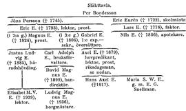 Skolmästaren E. E:s bror hemmansägaren i Fryksände sn (Värml.) Jöns Persson (d. 1745) var fader till Eric E. (f. 1722, d. 1793), som blev fil. magister i Uppsala 15 juni 1752. Han var lärjunge till Linné och uppehöll några år i Karlstad utan lön ett lektorat i naturalhistoria (Löfberg), men övergick, sedan han förgäves sökt erhålla lön, 1762 till lektoratet i grekiska och hebreiska där, som han behöll till 1787. E. E. undervisade även i franska. Hans »dagbok» 1722–62 är utg. av C. E. Nygren i »Värmland förr och nu» 1927. Den ger en intressant bild av E. E:s då moderna idéer och visar honom ej blott som ekonom i tidens stil utan också som entusiast för Rousseaus pedagogiska program. Eric E., som även var kyrkoherde och prost, var gift icke mindre än fyra gånger. I sitt andra gifte med Brita Aurivillia var Eric E. fader till prosten fil. magistern och teol. doktorn Magnus E. (f. 1763,d. 1824), riksdagsman 1817, som likaledes var lektor i Karlstad. Av dennes barn var häradshövdingen Justus Ludvig E. (f. 1806, d. 1885) fader till pedagogen fröken Elisabet Mathilda Vilhelmina E. (f. 1864, d. 1939). Elisabet E. utexaminerades från Högre lärarinneseminariet 1884, gjorde många utländska resor, var lärarinna vid Statens normalskola för flickor 1885–87, vid Lyceum för flickor 1887–92 och adjunkt vid Umeå folkskoleseminarium 1893–1904. Hon blev 1904 adjunkt och 1918 lektor i psykologi, pedagogik och svenska vid Folkskoleseminariet i Stockholm och avgick 1924. Hon skapade bl. a. sistnämnda seminariums bibliotek och var själv mycket beläst och mångsidig i sina kunskaper. Som lärarinna blev hon högt uppskattad. Hennes bror Ludvig Magnus E. (f. 1866, d. 1936) var borgmästare i Eksjö. En annan son till prosten Magnus E., bruksförvaltaren Carl Adolph E., var fader till bl. a. bandirektören David Magnus E. (f. 1843, d. 1899).