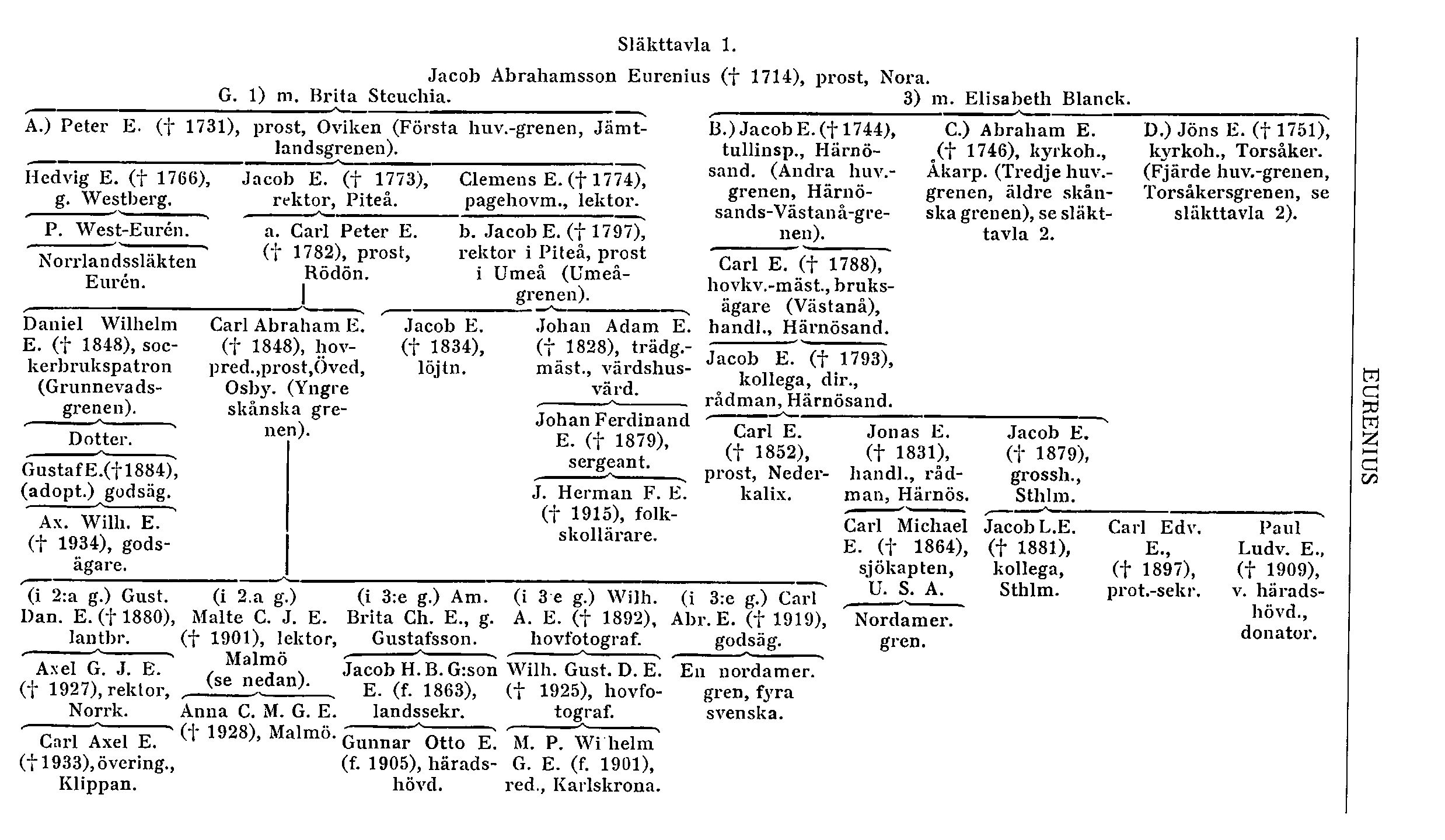 A. Första huvudgrenen (Jämtlandsgrenen) stammar från J. A. E:s nämnde son i Steuchska giftet magister Peter E. (f. 1660, d. 1731), lektor i Härnösand, kyrkoherde i Oviken (Jämtl.) och kontraktsprost, som var gift två gånger. Hans dotter i första giftet, Hedvig E. (d. 1766), blev g. m. komminister Olof Westberg (d. 1750); från deras son kyrkoherden Per West-Eurén stammar norrlandssläkten Eurén (se ovan, s. 675). Hennes helbror var magister Jacob E. (f. 1697, d. 1773), rektor i Piteå skola, medan en halvbror (född i P. E:s andra gifte med Catharina Rudin) var magister Clemens E. (f. 1711, d. barnlös 1774), som blev lärare och hovmästare för de kungl. pagerna 1744 och lektor i matematik vid Härnösands gymnasium 1754. Genom sitt gifte var han delägare i Kramfors (Qvist, Bucht). Från två C. E:s helsystrar stamma ätten af Huss och alla levande medlemmar av ätten Lilliesköld.